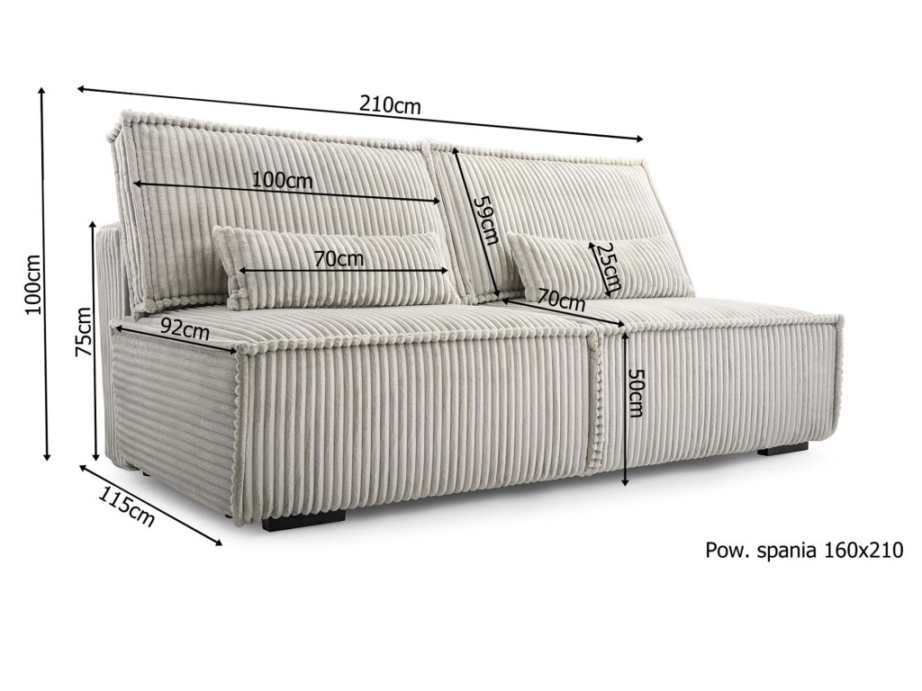 Kanapa posiada mechanizm rozkładania typu DL, dzięki któremu w kilka chwil zamienisz sofę w łóżko o dużej powierzchni spania. Dodatkowym atutem jest pojemnik na pościel, który ułatwia utrzymanie porządku w salonie i pozwala sprytnie przechowywać kołdry, poduszki czy koc.