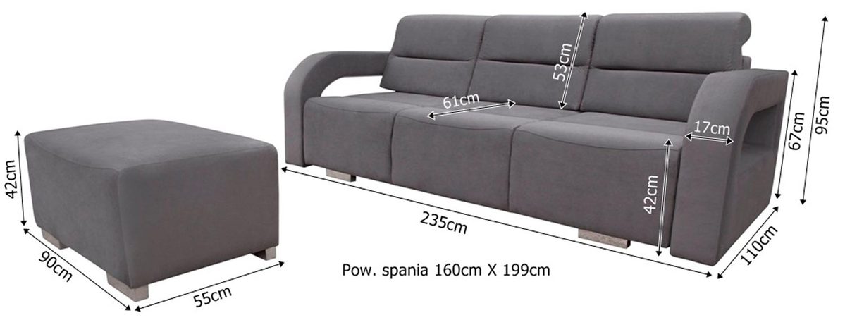 - Szerokość: 235 cm / Wysokość: 95 cm / Głębokość: 110 cm / Powierzchnia spania: 160×199 cm