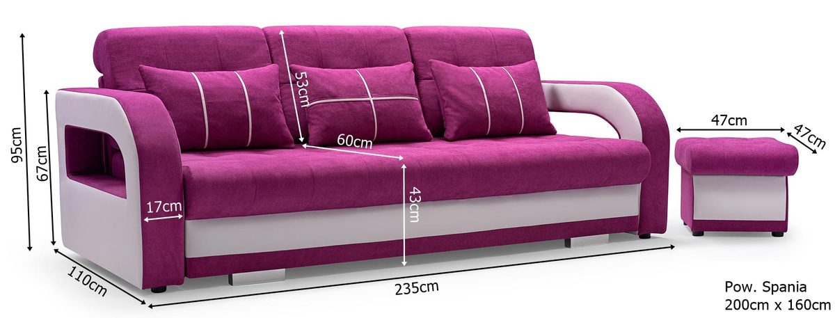- Szerokość: 235 cm / Wysokość: 95 cm / Głębokość: 110 cm / Powierzchnia spania: 200×160 cm