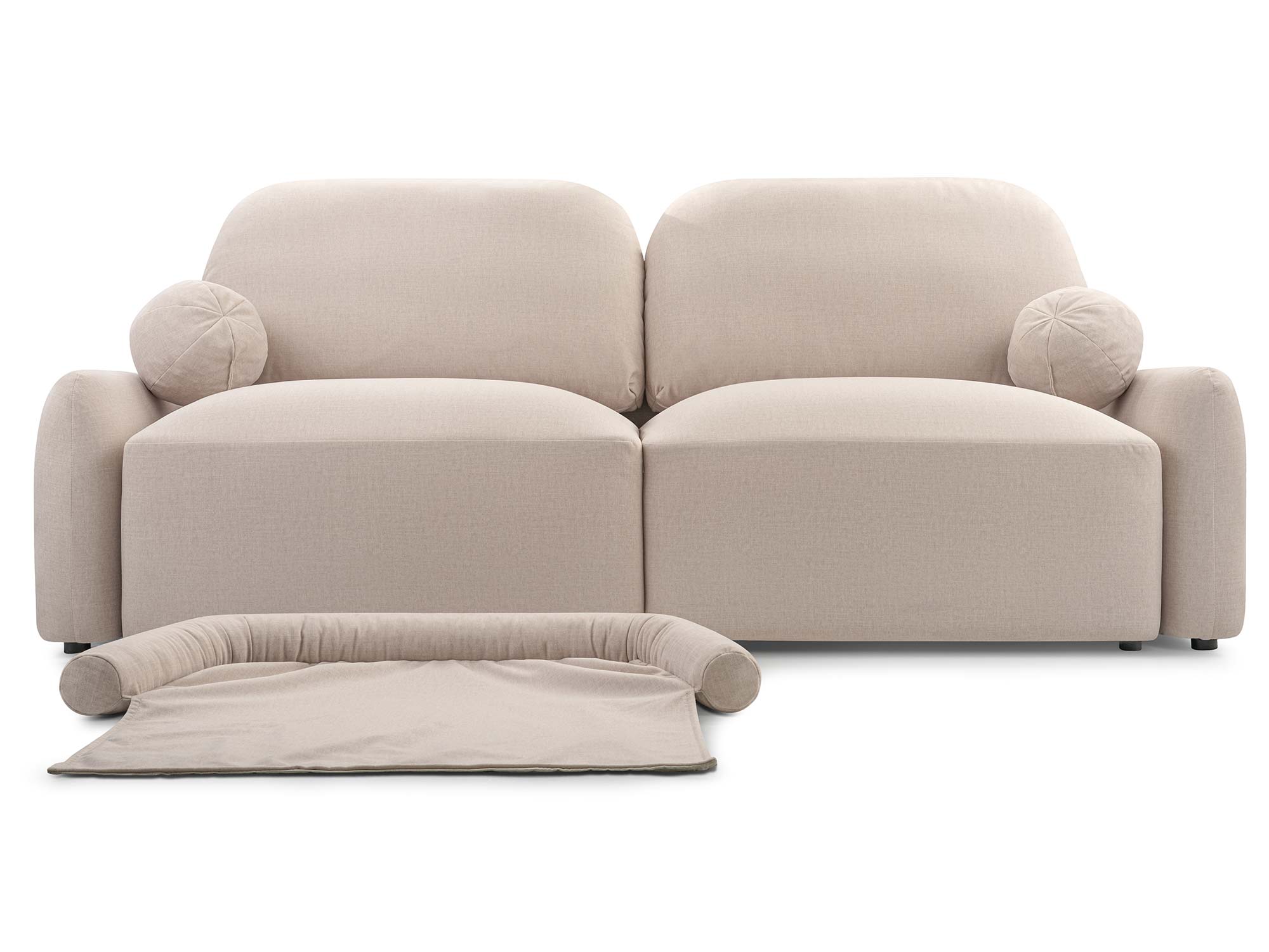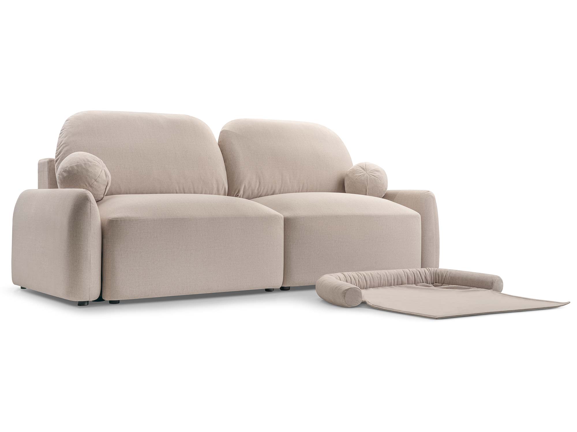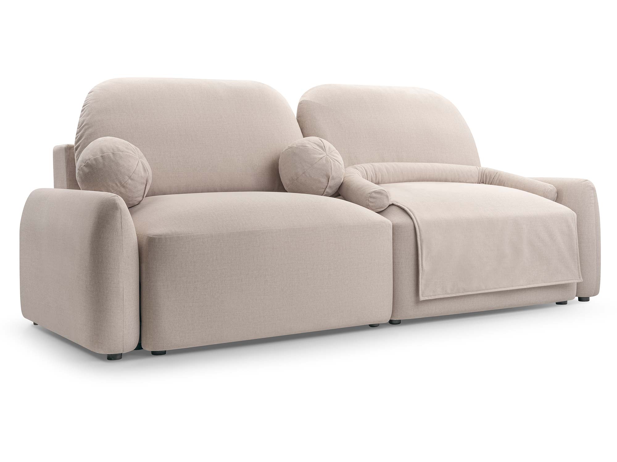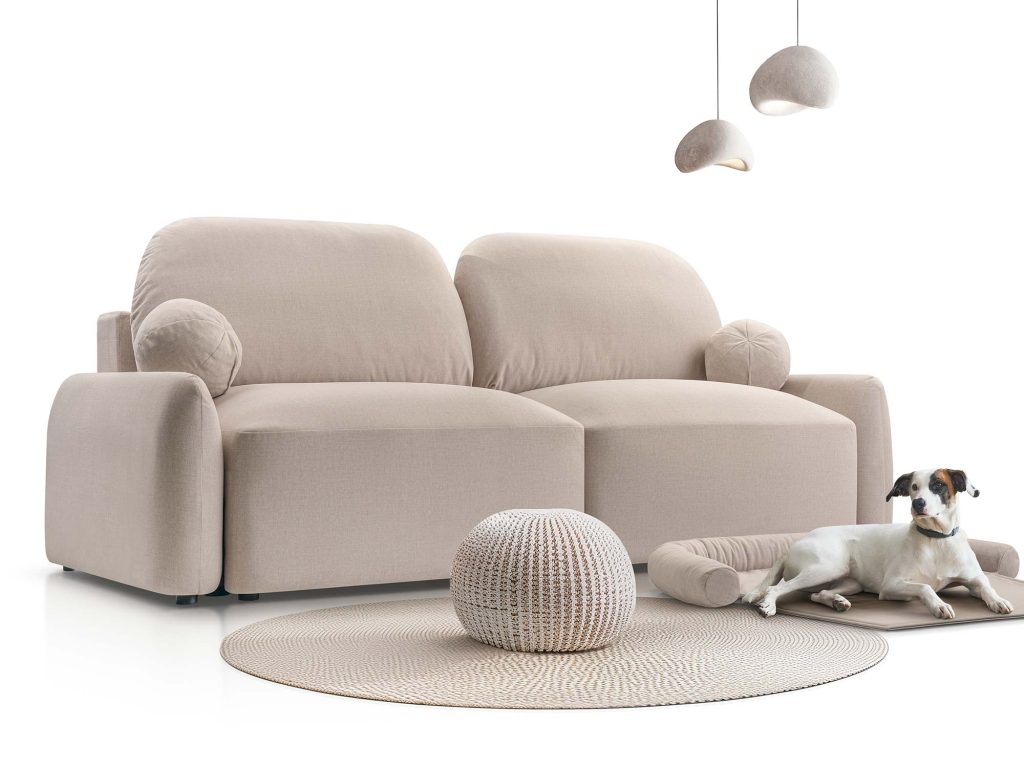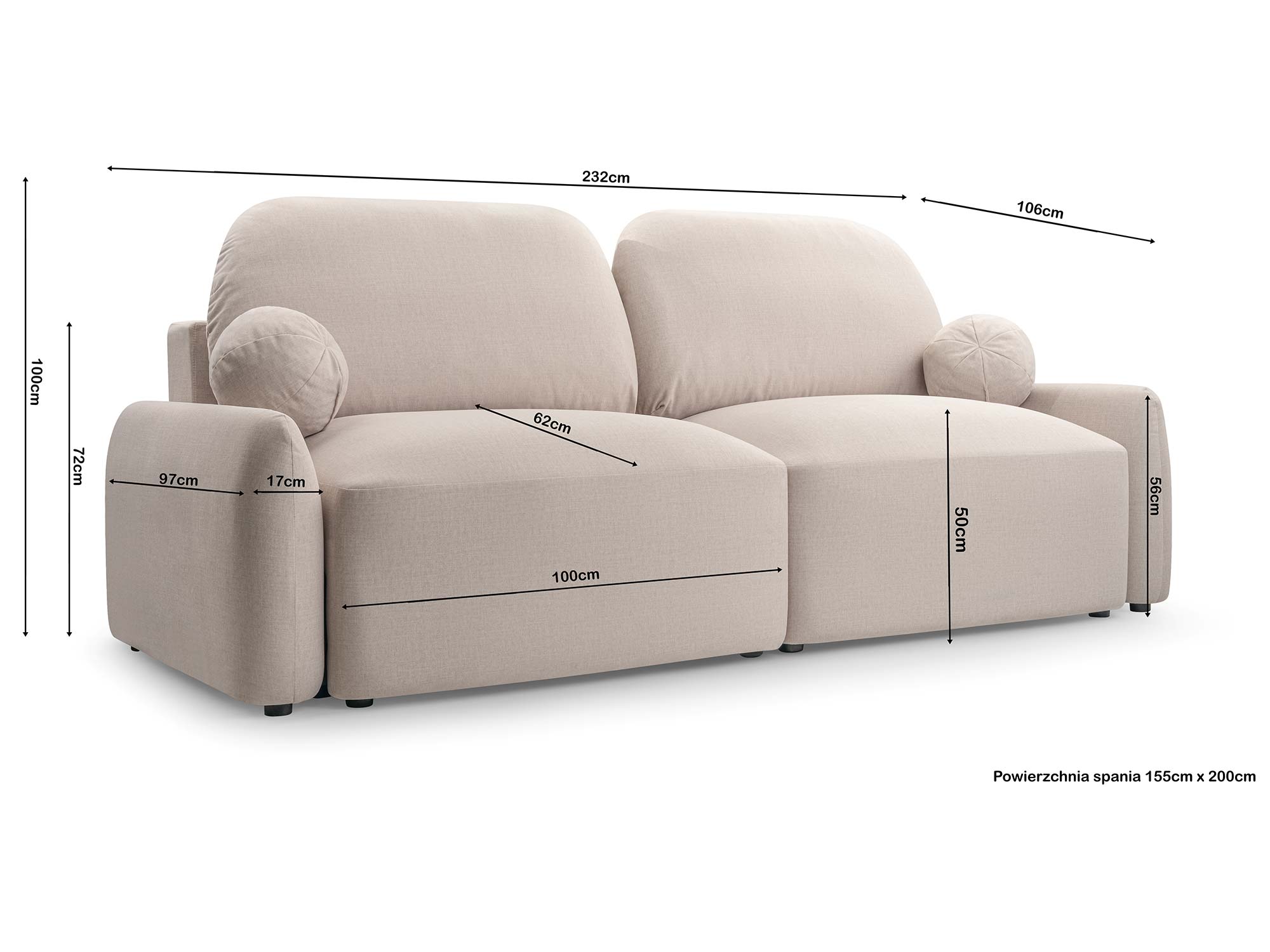 Obłe linie i subtelnie wyprofilowane kształty nadają sofie nowoczesnego, a jednocześnie przytulnego charakteru. To mebel, który wyróżnia się na tle tradycyjnych sof swoją świeżością i wyjątkową estetyką. Pod siedziskiem znajduje się praktyczny pojemnik na pościel, który pozwala zachować porządek i lepiej wykorzystać przestrzeń. Mechanizm rozkładania DL umożliwia szybkie i bezproblemowe przekształcenie sofy w pełnowymiarowe łóżko o powierzchni spania 155 × 200 cm.