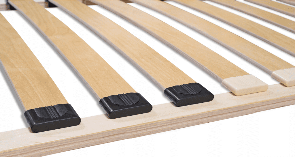 Konstrukcja jest nie tylko technicznie zaawansowana, ale także estetyczna – uchwyty mocujące listewki do ramy są przymocowane zszywkami, co nadaje całości schludnego wyglądu. Dzięki temu stelaż świetnie sprawdzi się nie tylko w nowoczesnych łóżkach, ale także w modelach z szerokimi ramami, gdzie każdy detal ma znaczenie.