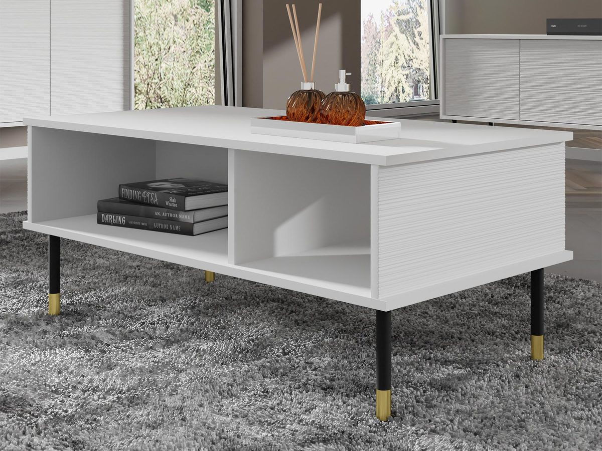 Korpus stolika kawowego Armonia wykonany jest z płyty laminowanej o grubości 16 mm, co zapewnia trwałość i odporność na codzienne użytkowanie. Fronty z płyty MDF o grubości 18 mm, ozdobione delikatnym, nieregularnym frezem, nadają stolikowi eleganckiego wyglądu i wyjątkowego charakteru. Metalowe nogi o wysokości 20 cm, wykończone w kolorze czarnym ze złotymi akcentami, dodają całości nowoczesności i lekkości.