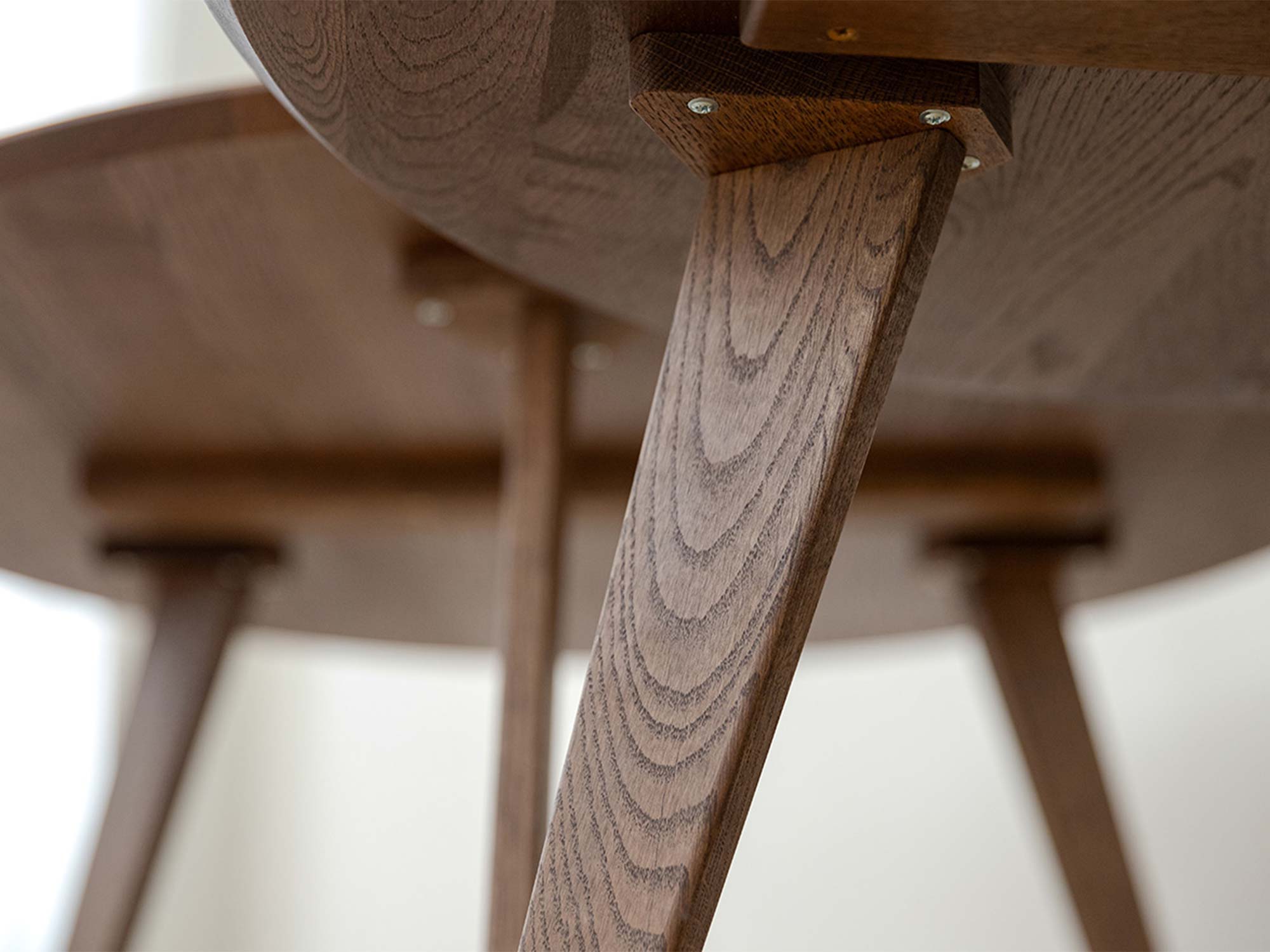 Klucz tkwi w materiale: naturalne drewno dębowe o wyraźnym rysunku słojów podkreślonym olejowanym wykończeniem. To dzięki niemu blat nabiera subtelnego połysku i jest przyjemny w dotyku. Olej nie tylko eksponuje strukturę drewna – zwiększa też odporność na codzienne użytkowanie, co czyni stolik praktycznym towarzyszem wielu domowych aktywności: od porannej kawy, przez popołudniową lekturę, po wieczorne spotkania w gronie najbliższych.