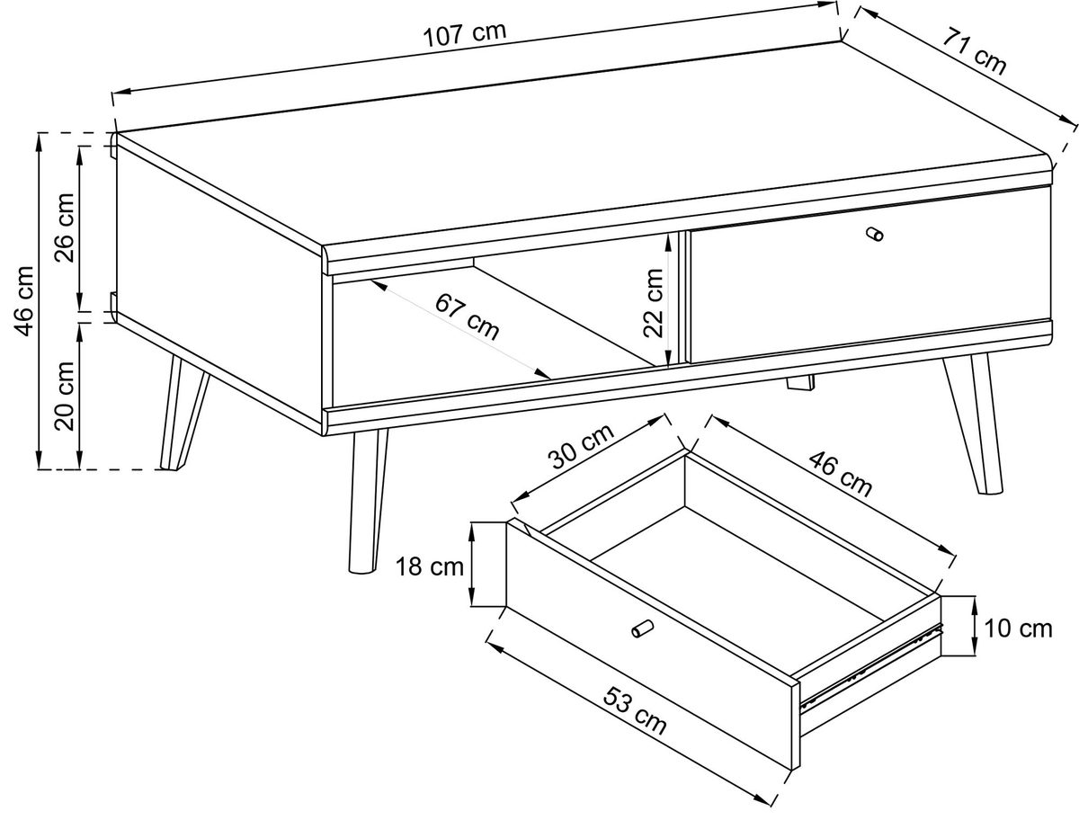 Rysunek techniczny stolika kawowego z szufladą i półką