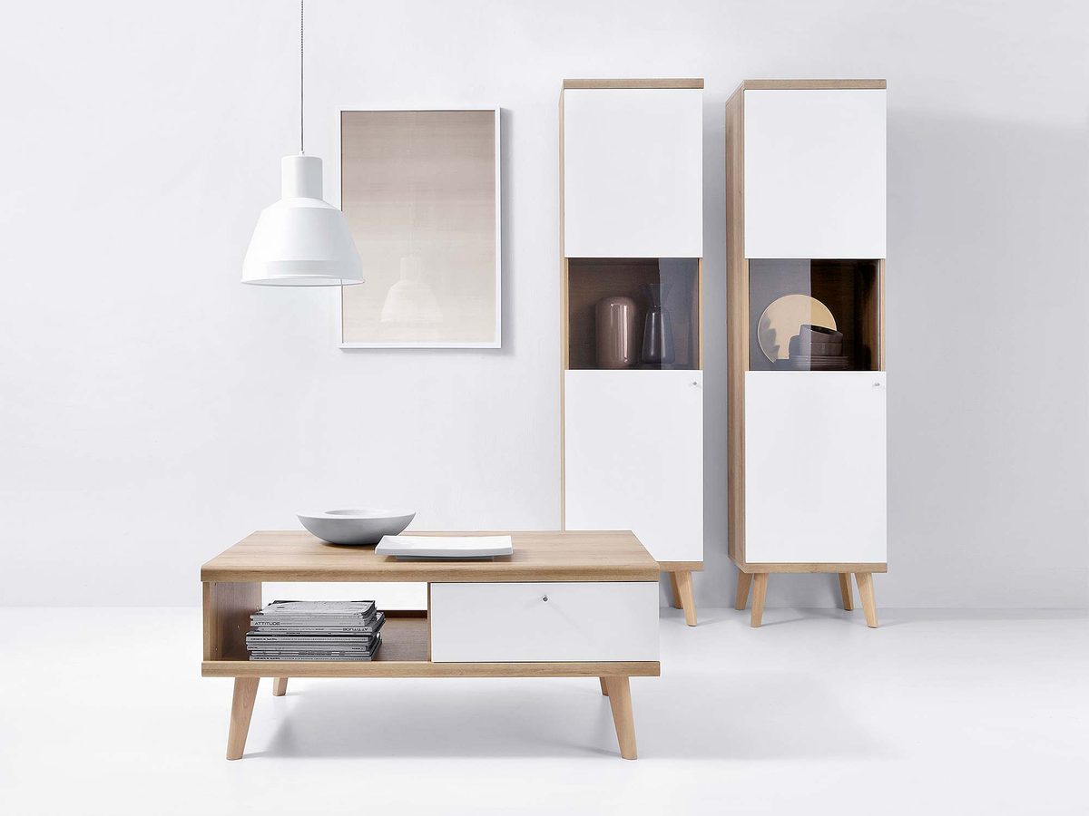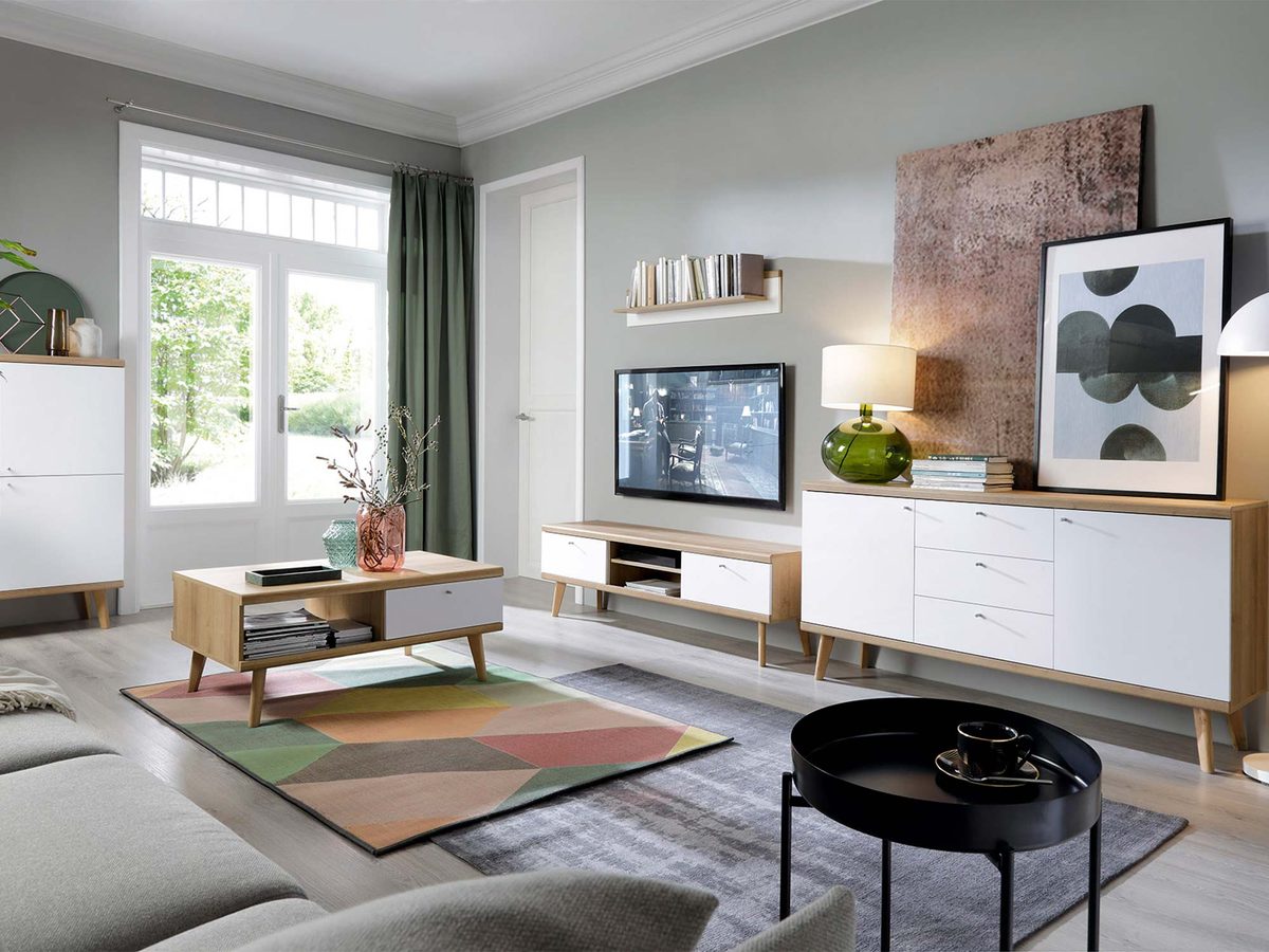Zestaw nowoczesnych mebli do salonu z białymi frontami i drewnem