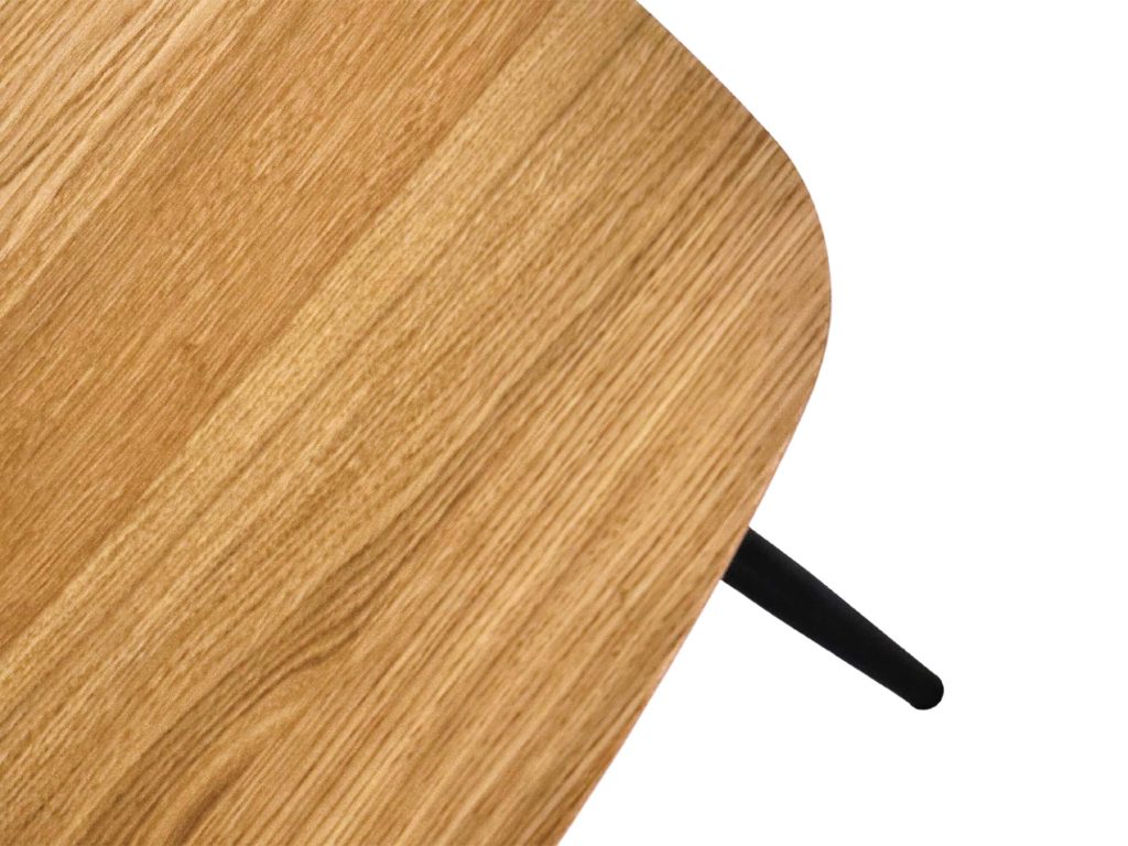 Blat o grubości 19 mm wykonany jest z olejowanego forniru dębowego na płycie MDF, co zapewnia nie tylko naturalny wygląd, ale i łatwość utrzymania w czystości. Jego unikalny charakter podkreśla precyzyjne podcięcie krawędzi pod kątem 30°, nadające bryle lekkości i subtelnej elegancji. Solidność i nowoczesny wygląd dopełniają stożkowe metalowe nogi o średnicy 25 mm, malowane proszkowo na kolor czarny.