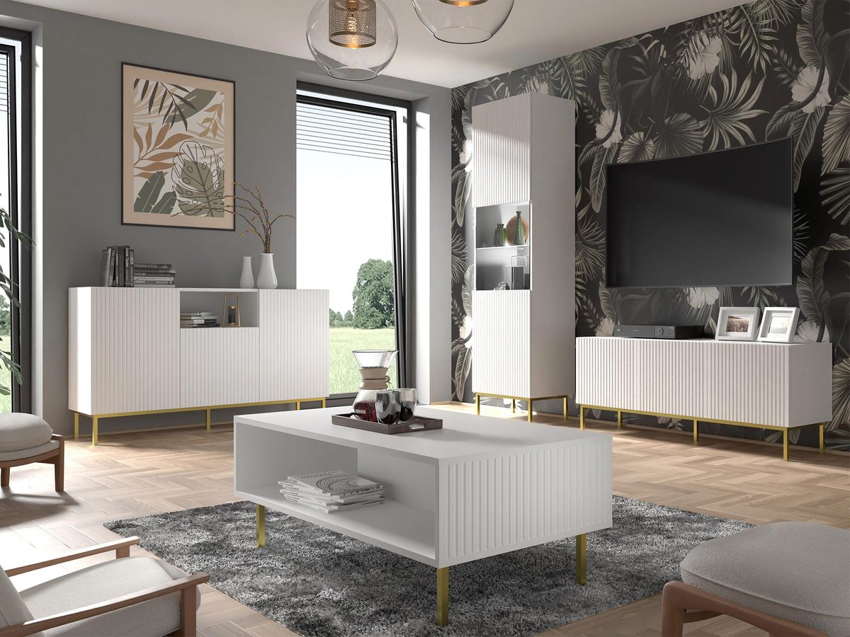 - Elegancki design: Biały matowy korpus i fronty w połączeniu ze złotymi, metalowymi nóżkami tworzą harmonijną i stylową całość, która doskonale wpisuje się w najnowsze trendy wnętrzarskie.