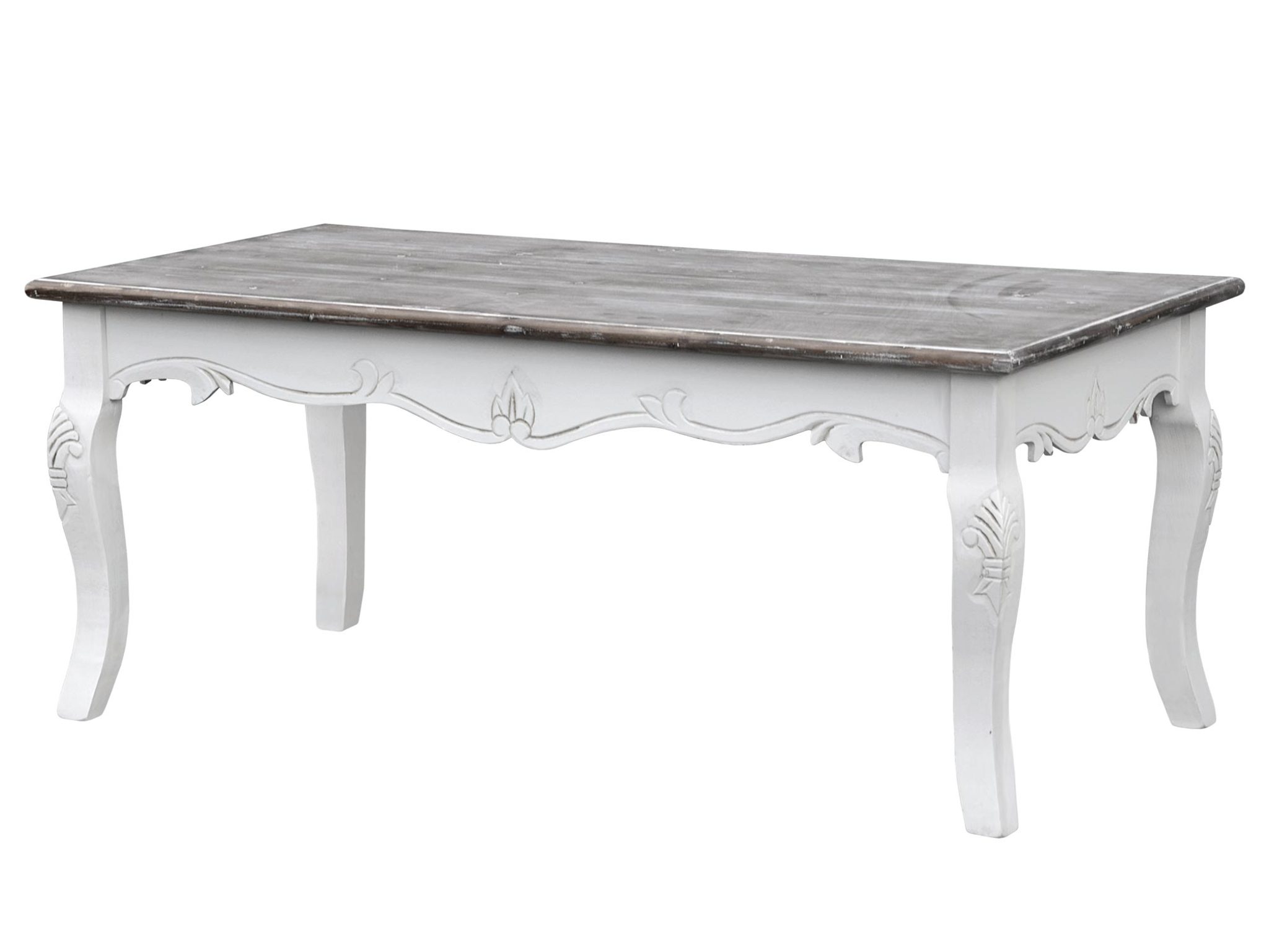 Stolik kawowy w stylu prowansalskim z rzeźbieniami w kolorze białym z przecieranym, ciemnobrązowym blatem. Produkt posiada gięte nóżki.