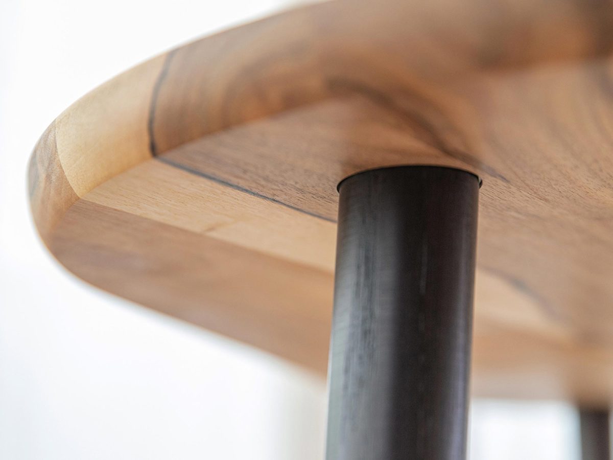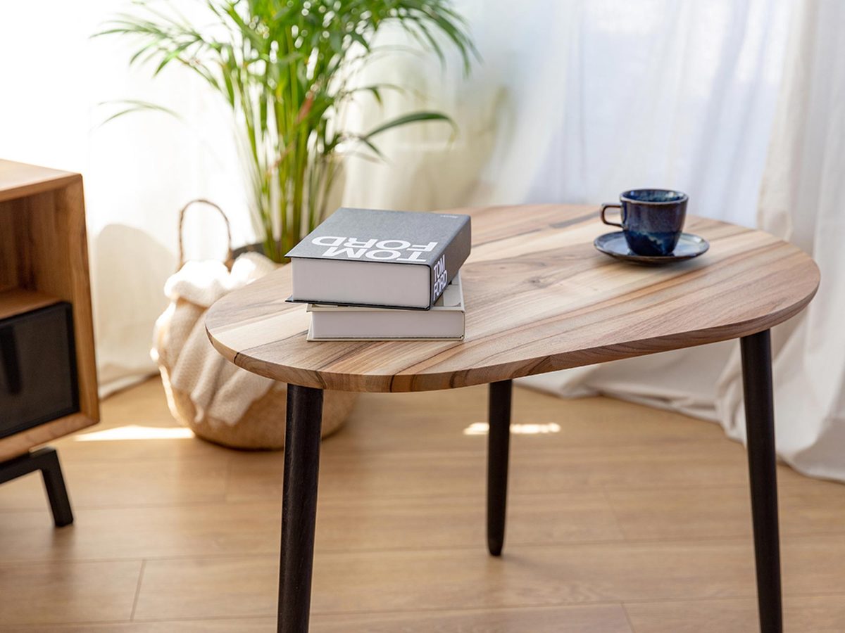 Stolik kawowy Awokado z drewna orzechowego, z lakierowaną powierzchnią i czarnymi nogami, wyróżnia się nie tylko funkcjonalnością, ale i niepowtarzalnym stylem. Jego nieregularne słoje i sęki to naturalne piękno drewna, które podkreśla unikalny charakter każdego egzemplarza.