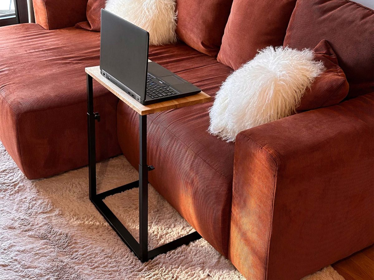 Regulowana wysokość blatu od 55 do 79 cm umożliwia personalizację w zależności od potrzeb – idealnie sprawdzi się zarówno przy niskiej sofie, jak i jako mobilne biurko. Dzięki podklejeniu podstawy filcem, stolik nie rysuje podłogi i można go łatwo przestawiać bez obawy o uszkodzenia powierzchni.