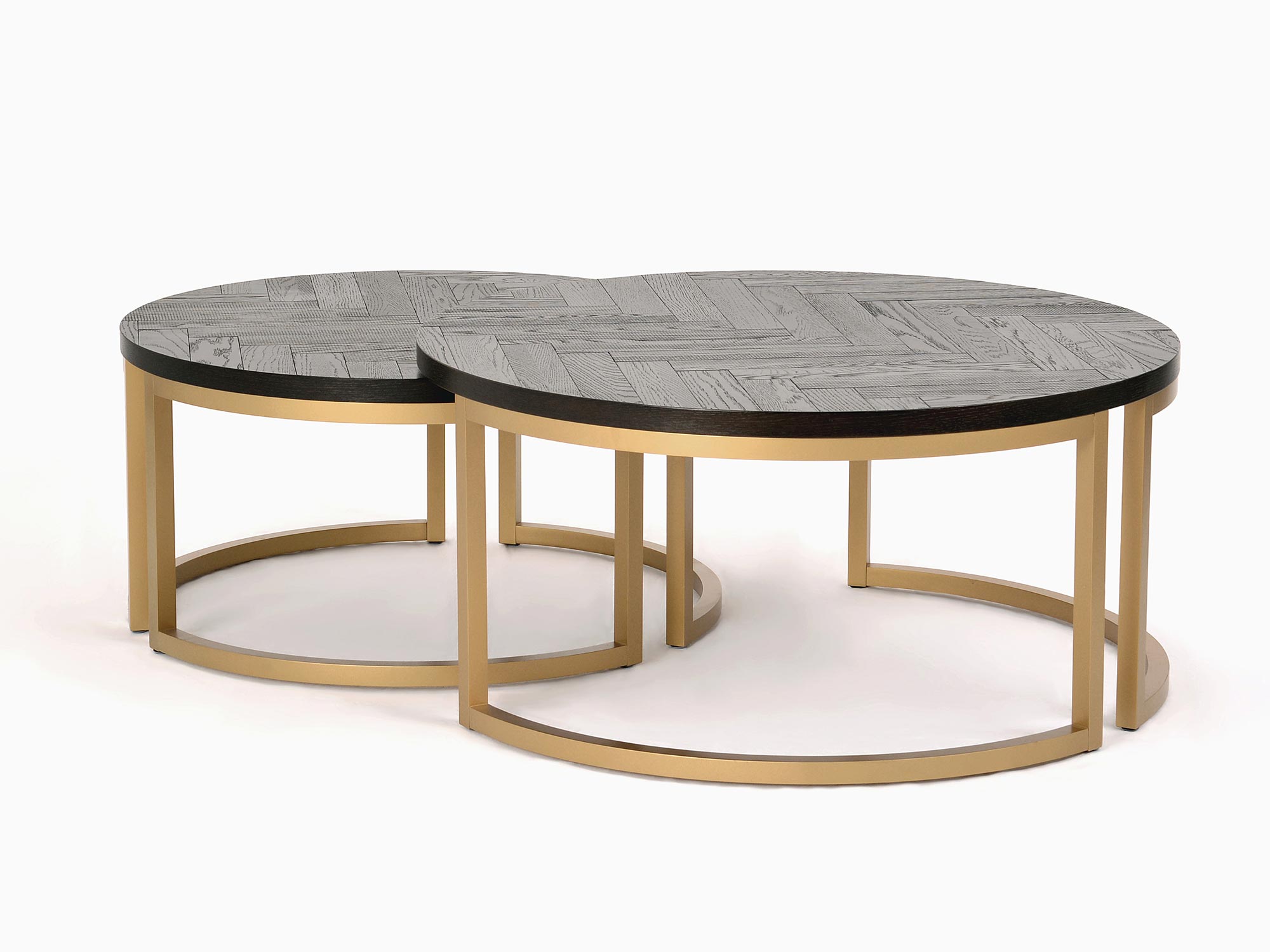 Stylowe stoliki kawowe Andaluzja to wyjątkowa propozycja łącząca nowoczesność, retro i glamour. Okrągły blat z intarsją w jodełkę w eleganckim czarnym połysku idealnie komponuje się z mosiężnymi nogami, nadając całemu meblowi szlachetności i charakteru. Stoliki wykonane z drewna bukowego oraz litego drewna dębowego są gwarancją solidności oraz luksusowego wyglądu. Doskonałe do nowoczesnych i klasycznych wnętrz, które wymagają subtelnej elegancji.