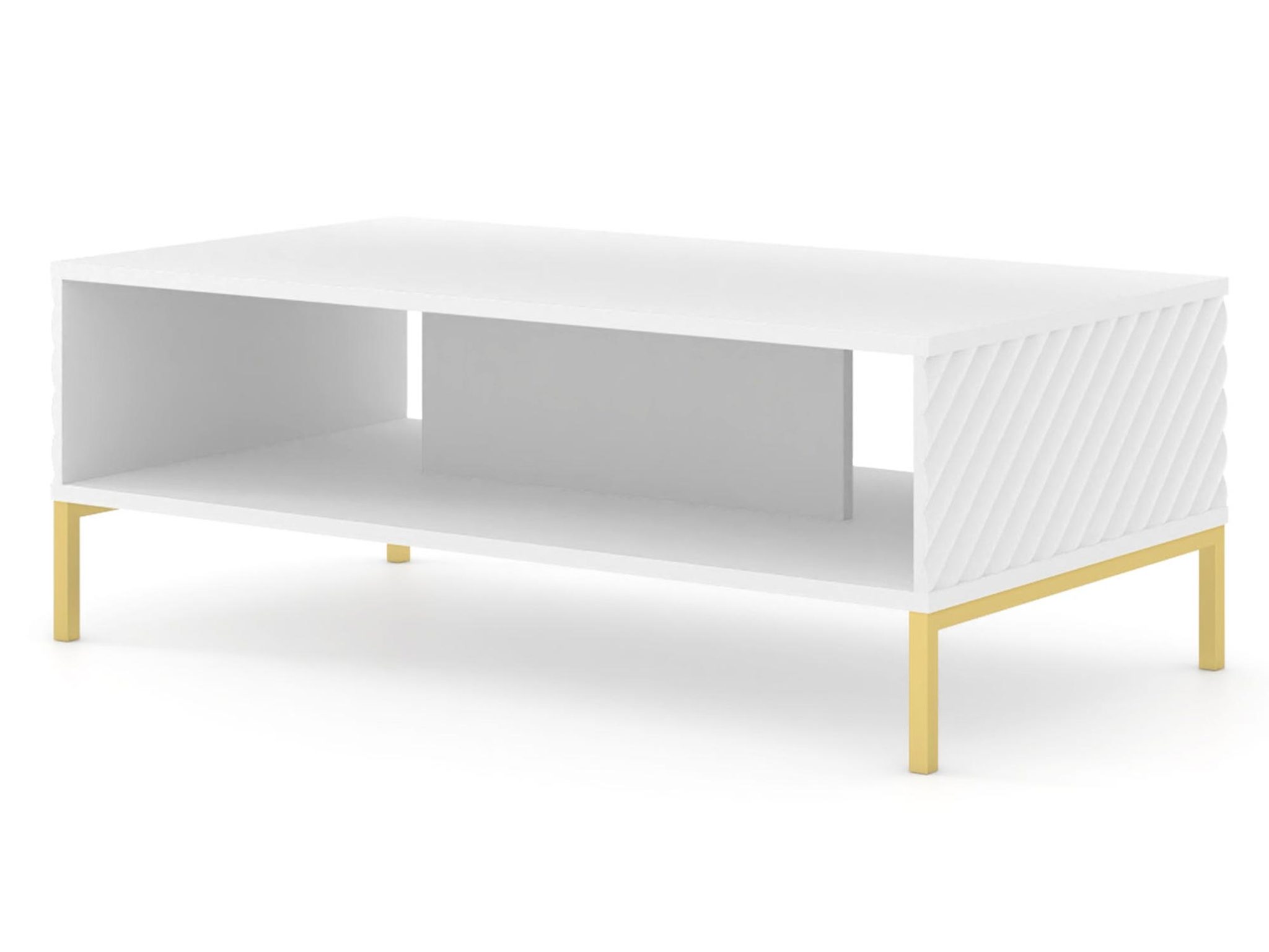 Stylowy Stolik Kawowy Loom wyróżnia się nowoczesnym wyglądem oraz solidnym wykonaniem. Korpus stolika wykonany jest z płyty laminowanej, co zapewnia trwałość i odporność na codzienne użytkowanie. Fronty z płyty MDF, frezowane i malowane na biały mat, dodają meblowi nowoczesności i subtelnej elegancji. Metalowe nogi w kolorze złotym metalik podkreślają wyrafinowany charakter stolika, dodając mu lekkości i stylu.