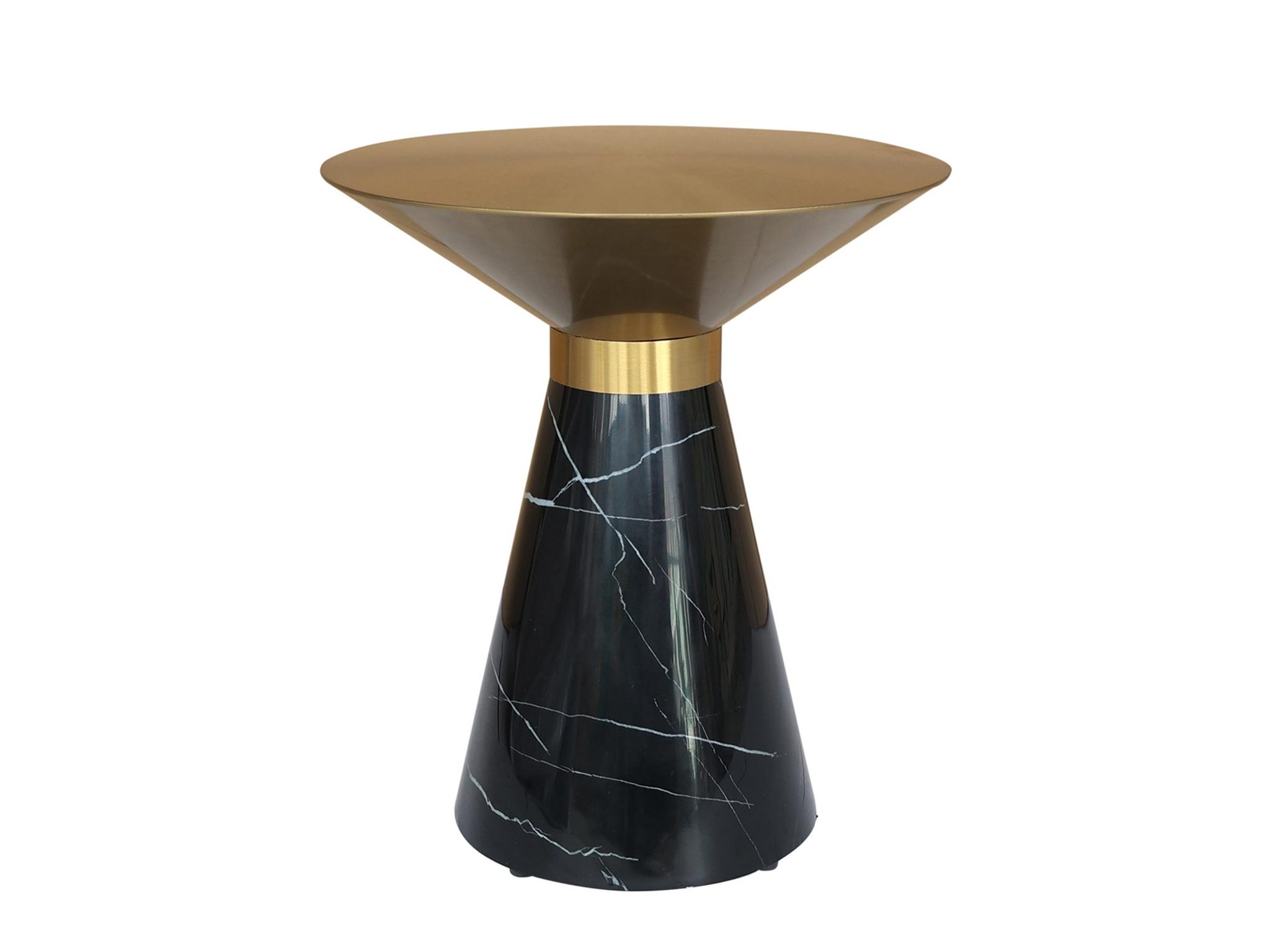 Elegancki stolik Virtus to doskonały wybór dla tych, którzy pragną połączyć nowoczesny design z luksusowymi akcentami. Czarna podstawa w kształcie stożka imitująca marmur oraz złoty blat ze stali nierdzewnej tworzą niepowtarzalną harmonię stylu i jakości. Ten stolik doskonale sprawdzi się zarówno w nowoczesnych, jak i klasycznych wnętrzach, dodając im elegancji i prestiżu.