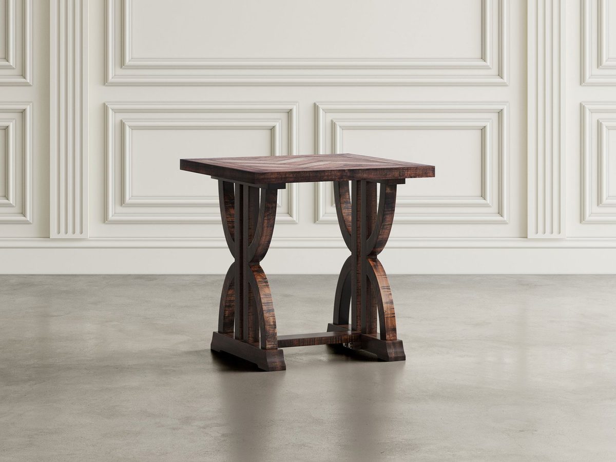 Stolik drewniany Avola to elegancki mebel, który idealnie wpasuje się w klasyczne i prowansalskie wnętrza. Charakteryzuje się masywnym blatem z intarsją w jodełkę, która nadaje mu unikalny, ponadczasowy wygląd. Na nogach w kształcie krzyża, z wyraźnie zaznaczoną strukturą drewna, stolik zyskuje charakter oraz solidność. Kolor ciemnego dębu w połączeniu z detalami konstrukcyjnymi tworzy doskonałą harmonię, która zachwyca swoją prostotą i elegancją.