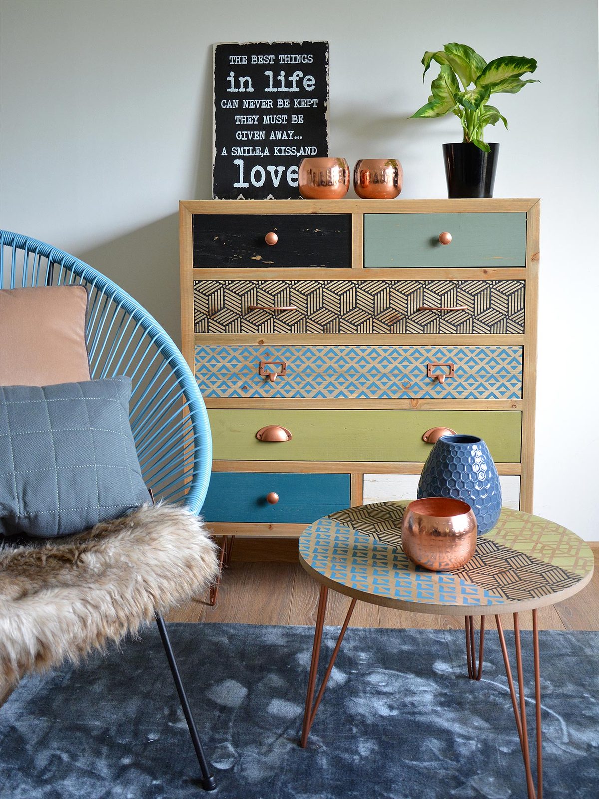 - Inne szczegóły: Blat z niejednolitym wzorem i kolorami, metalowe nogi typu hairpin w kolorze miedzianym, ręcznie malowany