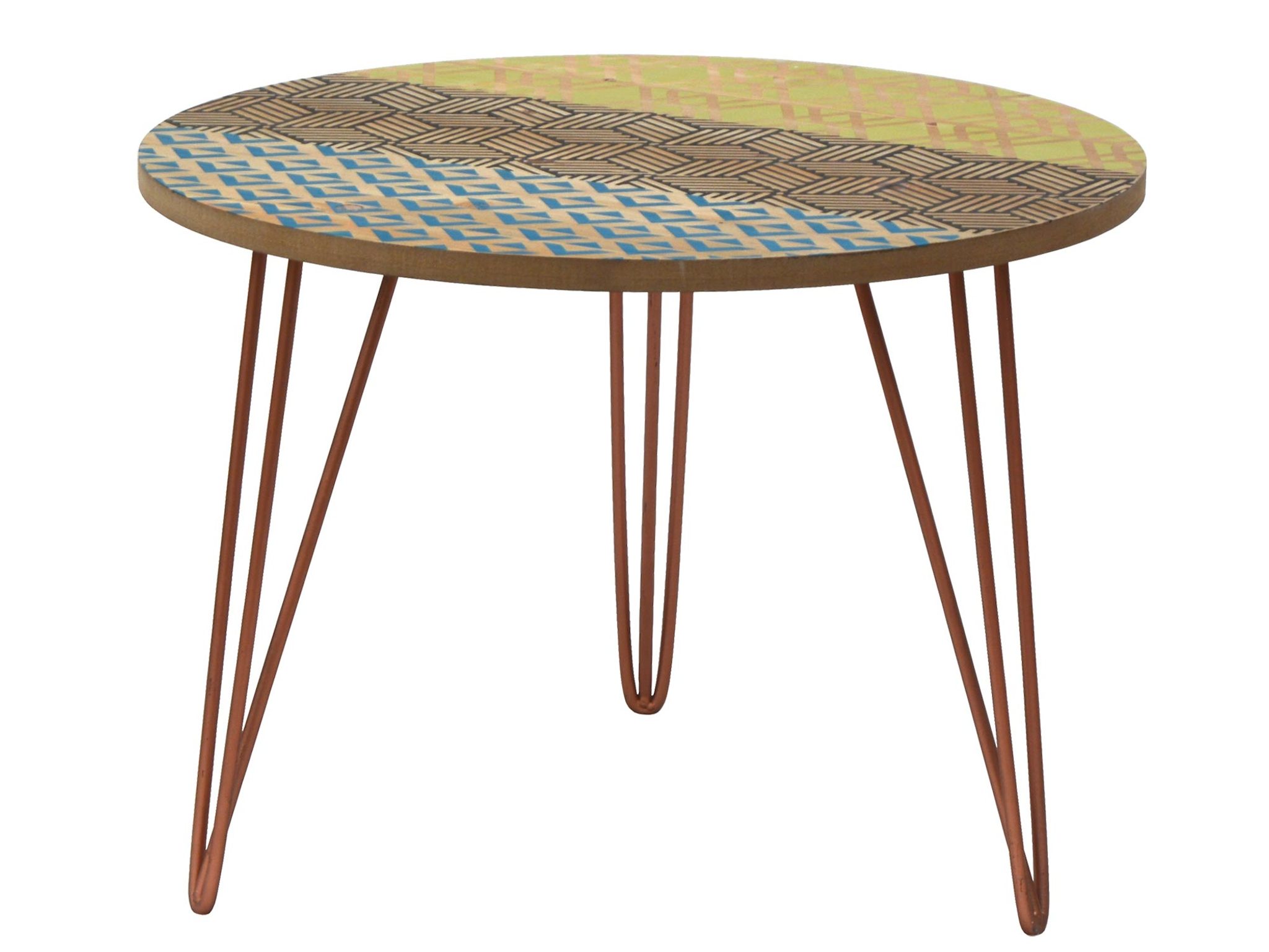- Kolor: Naturalne jasne drewno (blat), Wielokolorowy wzór (blat), Miedziane nogi