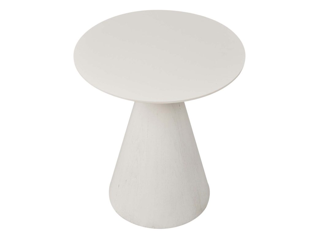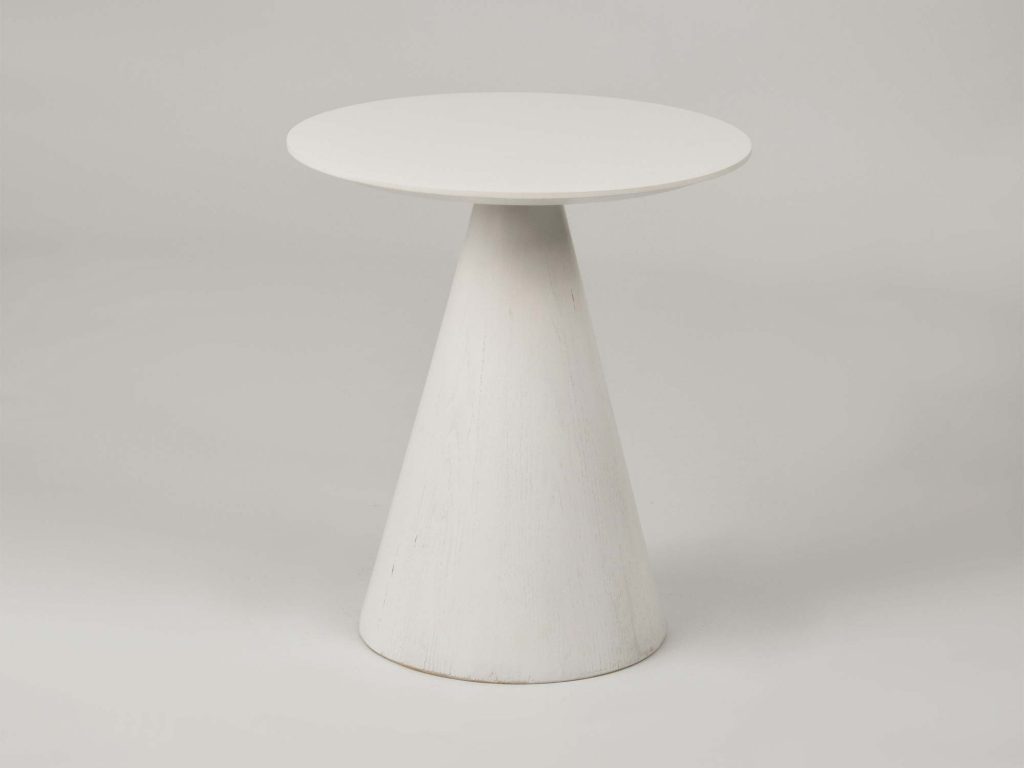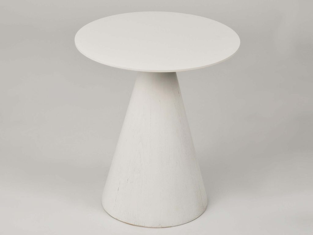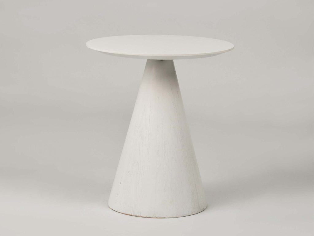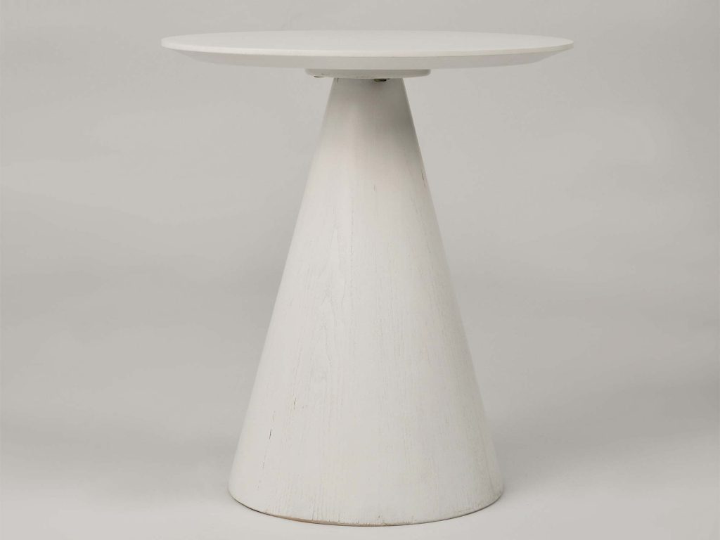 Minimalistyczny stolik z okrągłym blatem i podstawie w kształcie stożka. Konstrukcja wykonana jest z miękkiego drewna, całość w jednolitym kolorze białym. Stolik posiada widoczną strukturę drewna i niejednolitą powierzchnię.