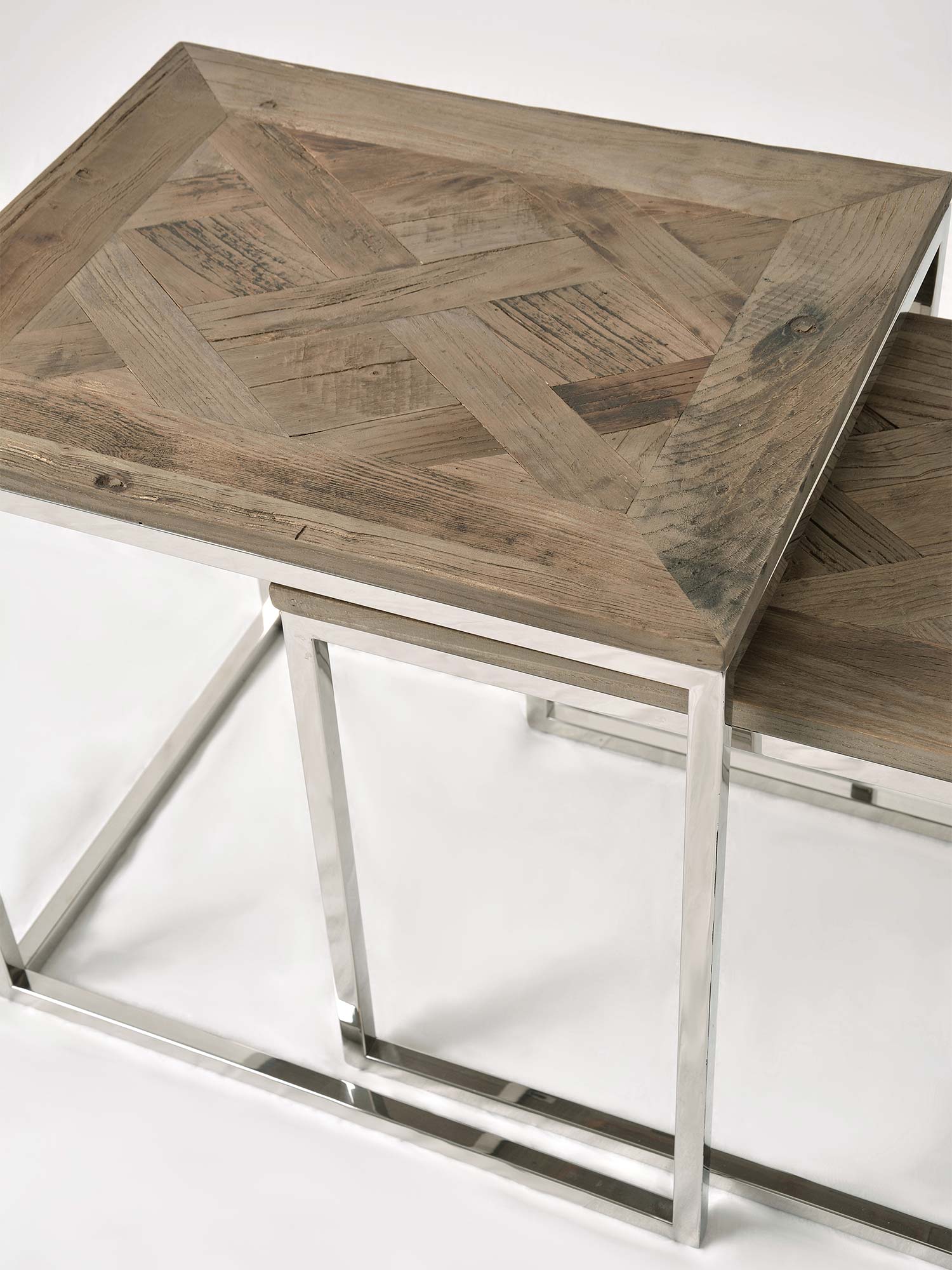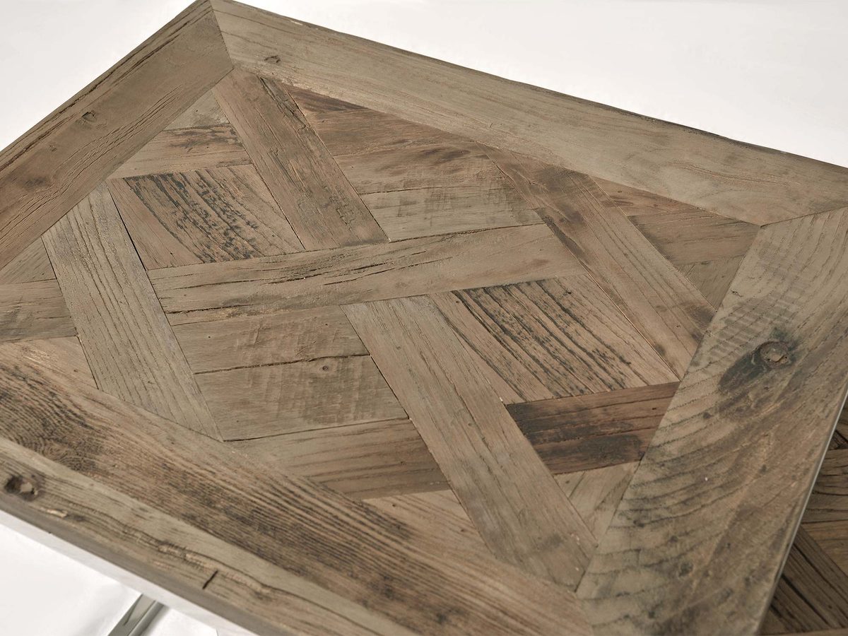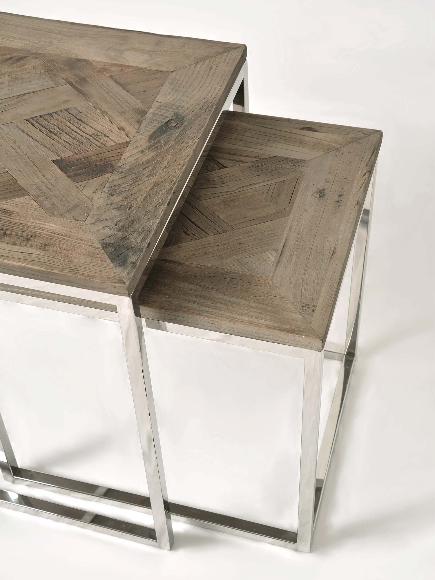 Stylowy zestaw stolików w stylu glamour, idealny do nowoczesnych wnętrz. Wykonany na stalowej ramie, z blatem z ciemnego, szczotkowanego drewna recyklingowego, pokrytego subtelnym bieleniem, zestaw ten łączy elegancję i funkcjonalność. Intarsja w jodełkę nadaje blatom unikalnego charakteru, a nowoczesny design stali nierdzewnej doskonale komponuje się z klasycznym drewnem, tworząc efektowną dekorację do każdego salonu, jadalni czy biura.