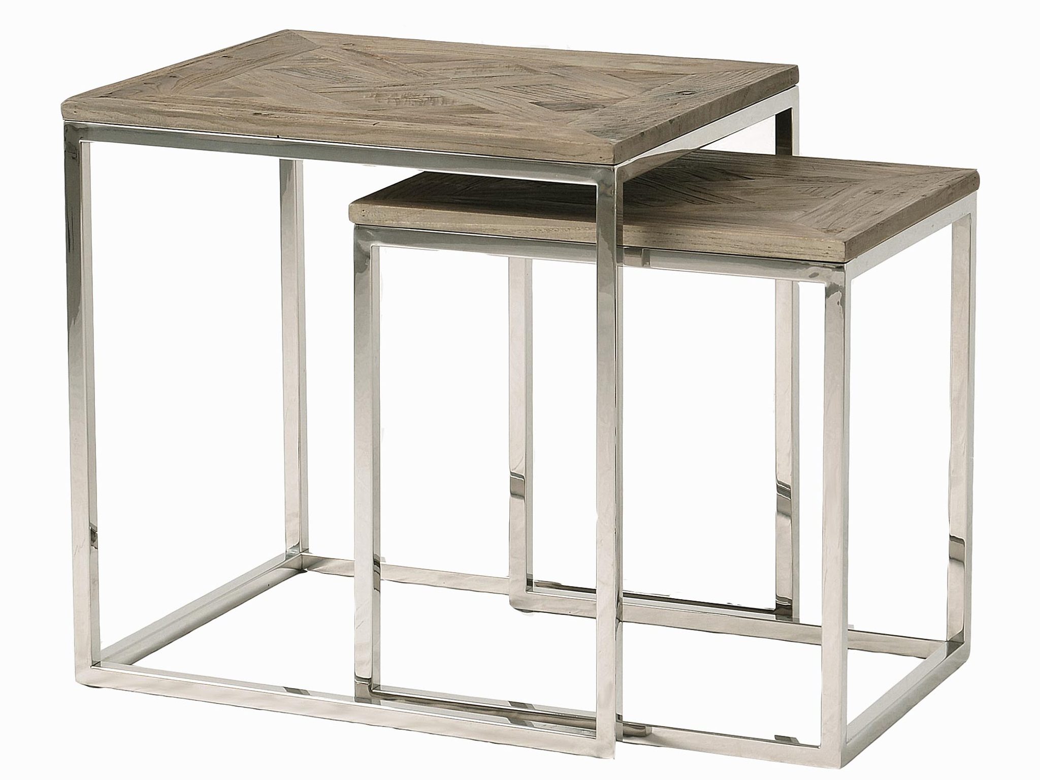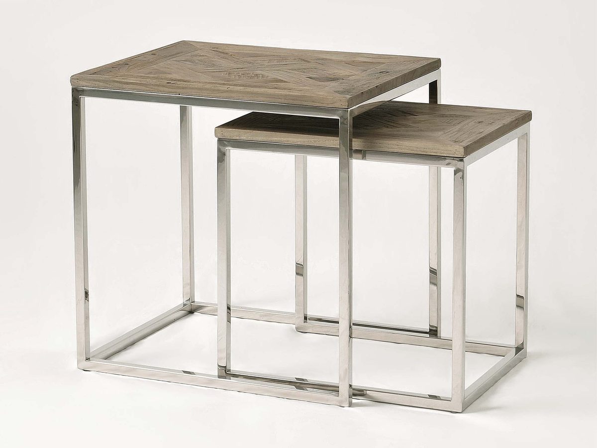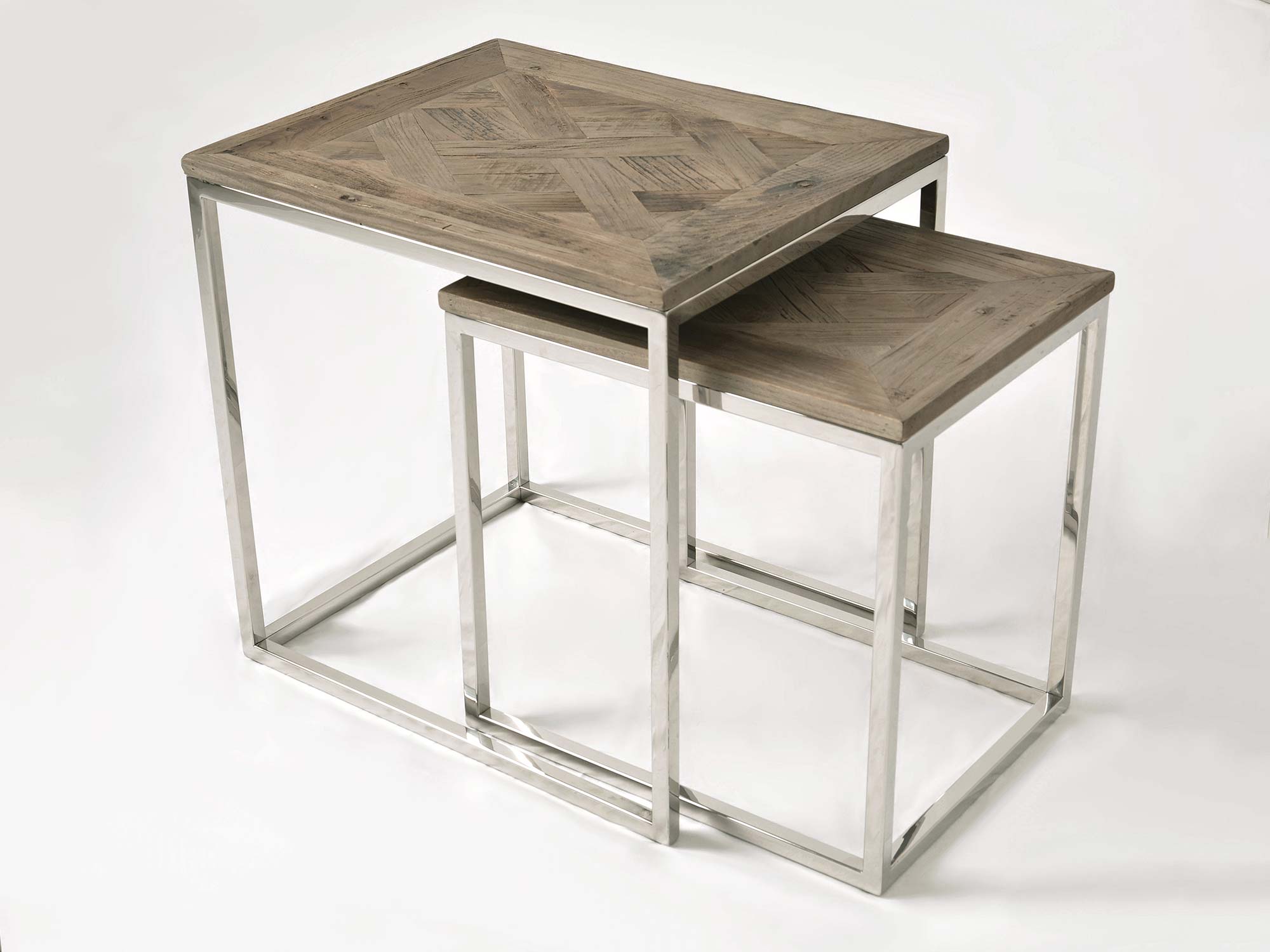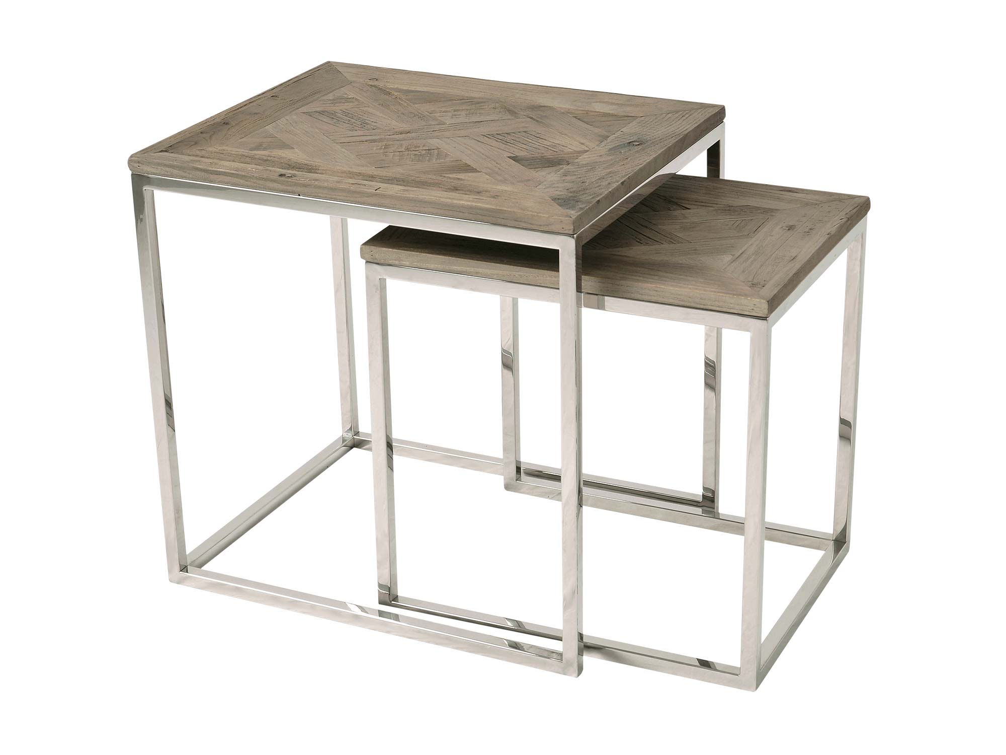 Stylowy zestaw stolików w stylu glamour, idealny do nowoczesnych wnętrz. Wykonany na stalowej ramie, z blatem z ciemnego, szczotkowanego drewna recyklingowego, pokrytego subtelnym bieleniem, zestaw ten łączy elegancję i funkcjonalność. Intarsja w jodełkę nadaje blatom unikalnego charakteru, a nowoczesny design stali nierdzewnej doskonale komponuje się z klasycznym drewnem, tworząc efektowną dekorację do każdego salonu, jadalni czy biura.