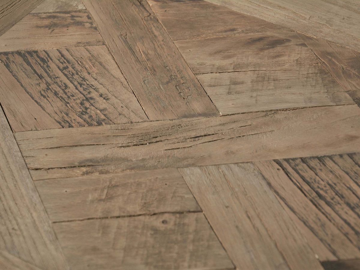 - Blaty z recyklingowego drewna wiązu w kolorze ciemnego, naturalnego drewna z bieleniem, z unikalną intarsją w jodełkę