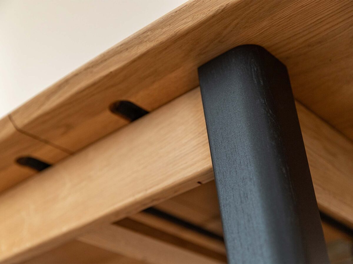 Cztery smukłe, czarne nogi wprowadzają elegancki kontrast i zapewniają stabilną bazę. Ich wizualna lekkość sprawia, że mebel nie przytłacza nawet mniejszego pomieszczenia, a przy tym stoi pewnie na podłodze – bez chwiania, bez kompromisów. To właśnie w takich detalach kryje się klasa stołu Basic: konsekwencja stylistyczna, precyzyjne spasowanie elementów, staranność wykończenia.