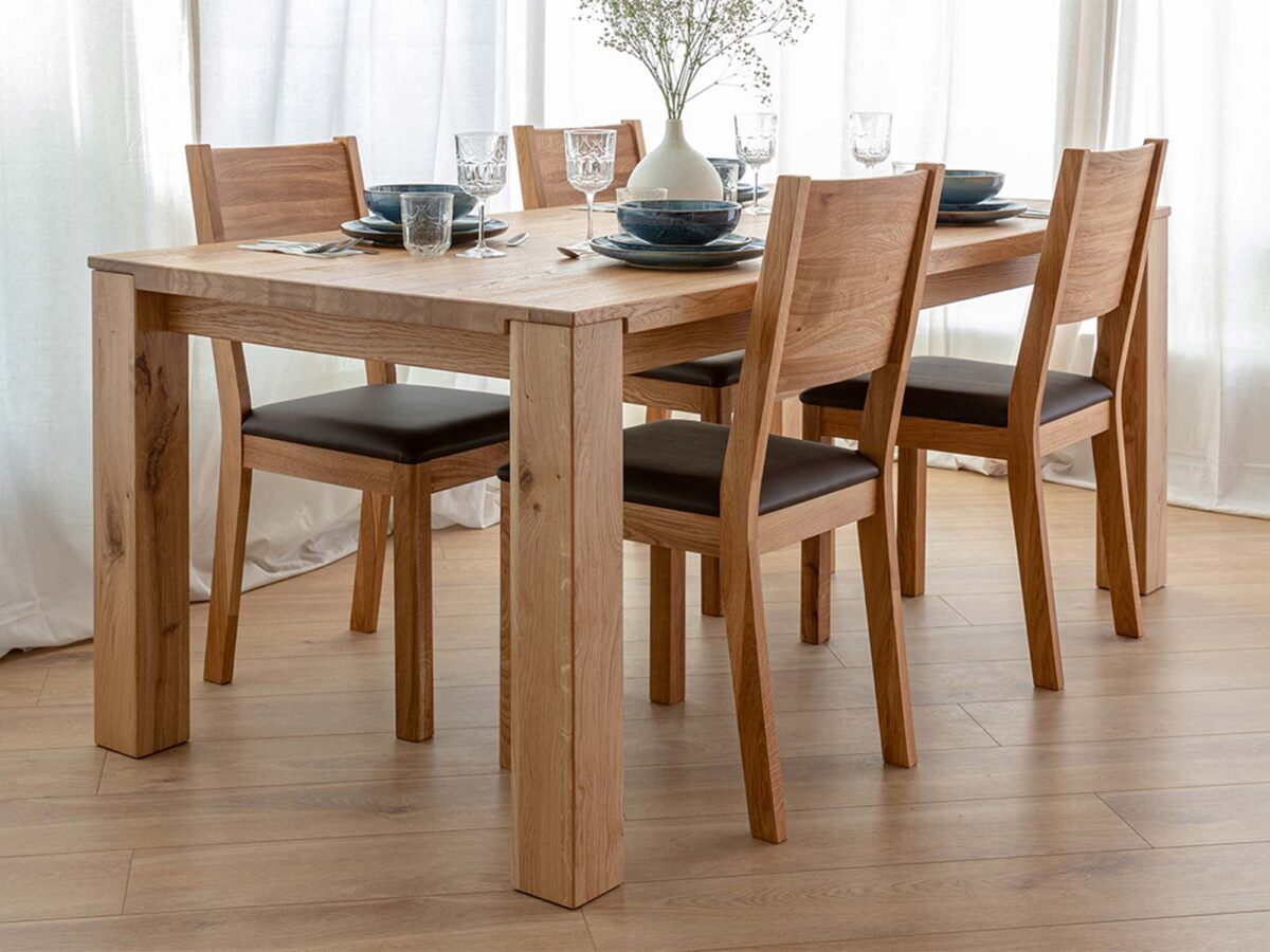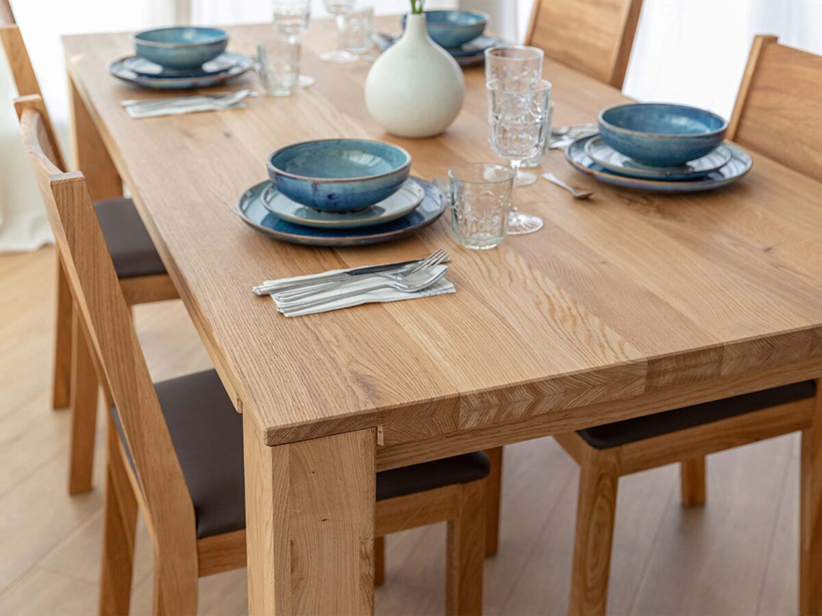 - Naturalne piękno dębu – każdy stół jest niepowtarzalny dzięki słojom i sękom.