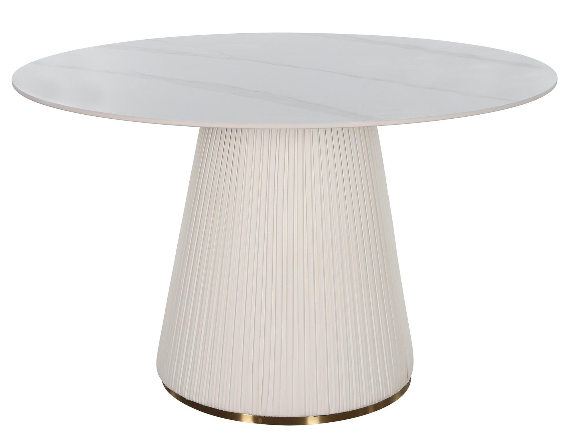 Nowoczesny i elegancki stół Virtus o minimalistycznym designie doskonale komponuje się z każdym wnętrzem. Podstawa w kształcie stożka, pokryta ekologiczną skórą o pionowych plisach, przyciąga uwagę i dodaje luksusowego charakteru. Biały blat imitujący marmur stanowi trwałą i estetyczną powierzchnię, która idealnie harmonizuje z ciepłymi złotymi akcentami podstawy. Ten wyjątkowy mebel to doskonały wybór dla osób ceniących nowoczesną stylistykę i najwyższą jakość wykonania.