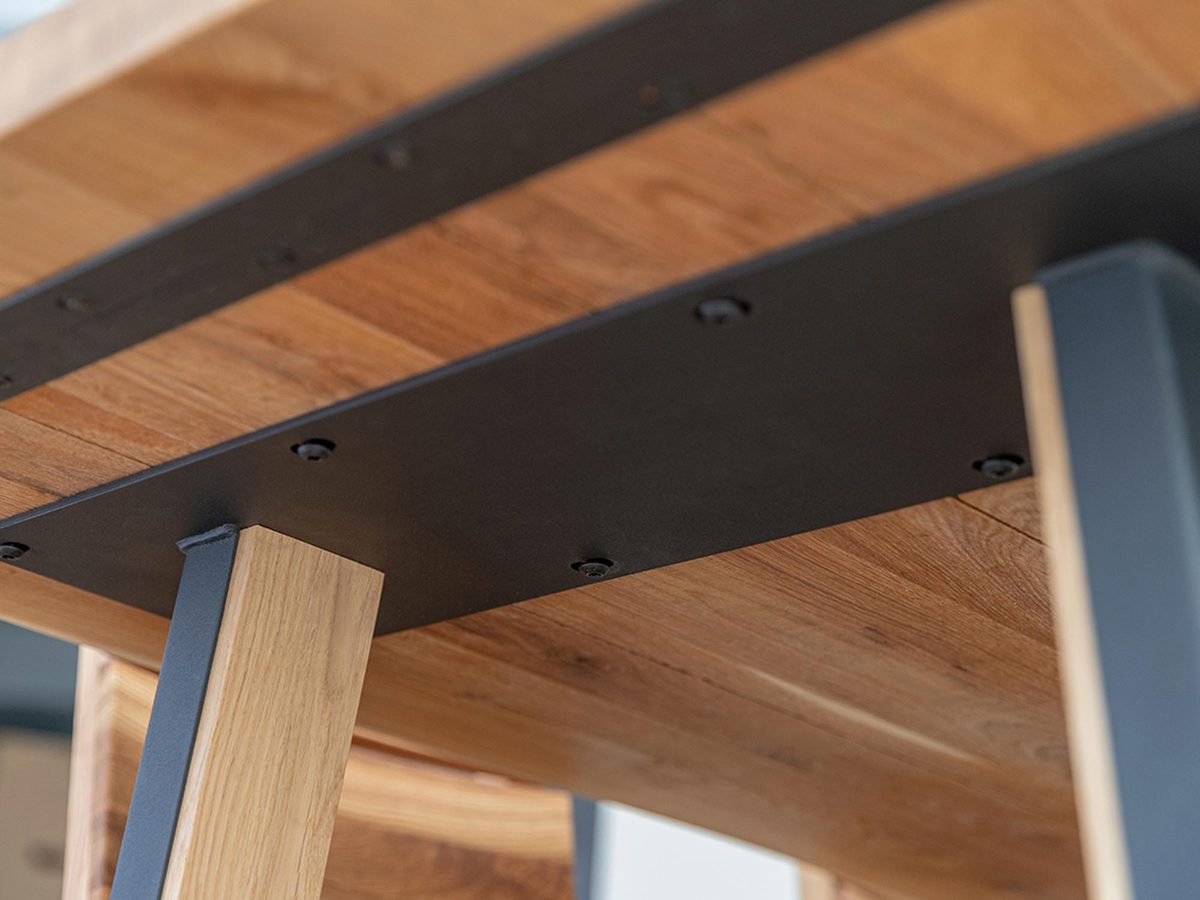 Detal połączenia blatu i metalowej nogi w stole loftowym