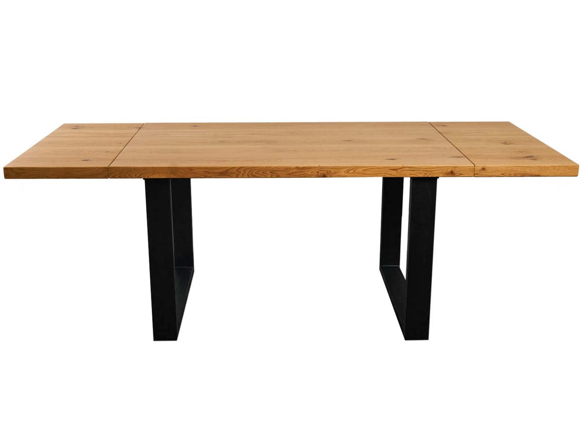 Po pierwsze Stół drewniany industrialny rozkładany na metalowych nogach to doskonałej jakości model, który stanowi idealne połączenie dębowego blatu z solidnymi metalowym nogami w czarnym kolorze. Po drugie stół został wyposażony w blat do wyboru w naturalnym nieregularnym kształcie lub prostym i skośnym wykończeniu krawędzi. Ponadto stół dzięki niezwykle praktycznym dostawkom pozwoli w prosty i szybki sposób pomieścić przy nim wszystkich zaproszonych gości.