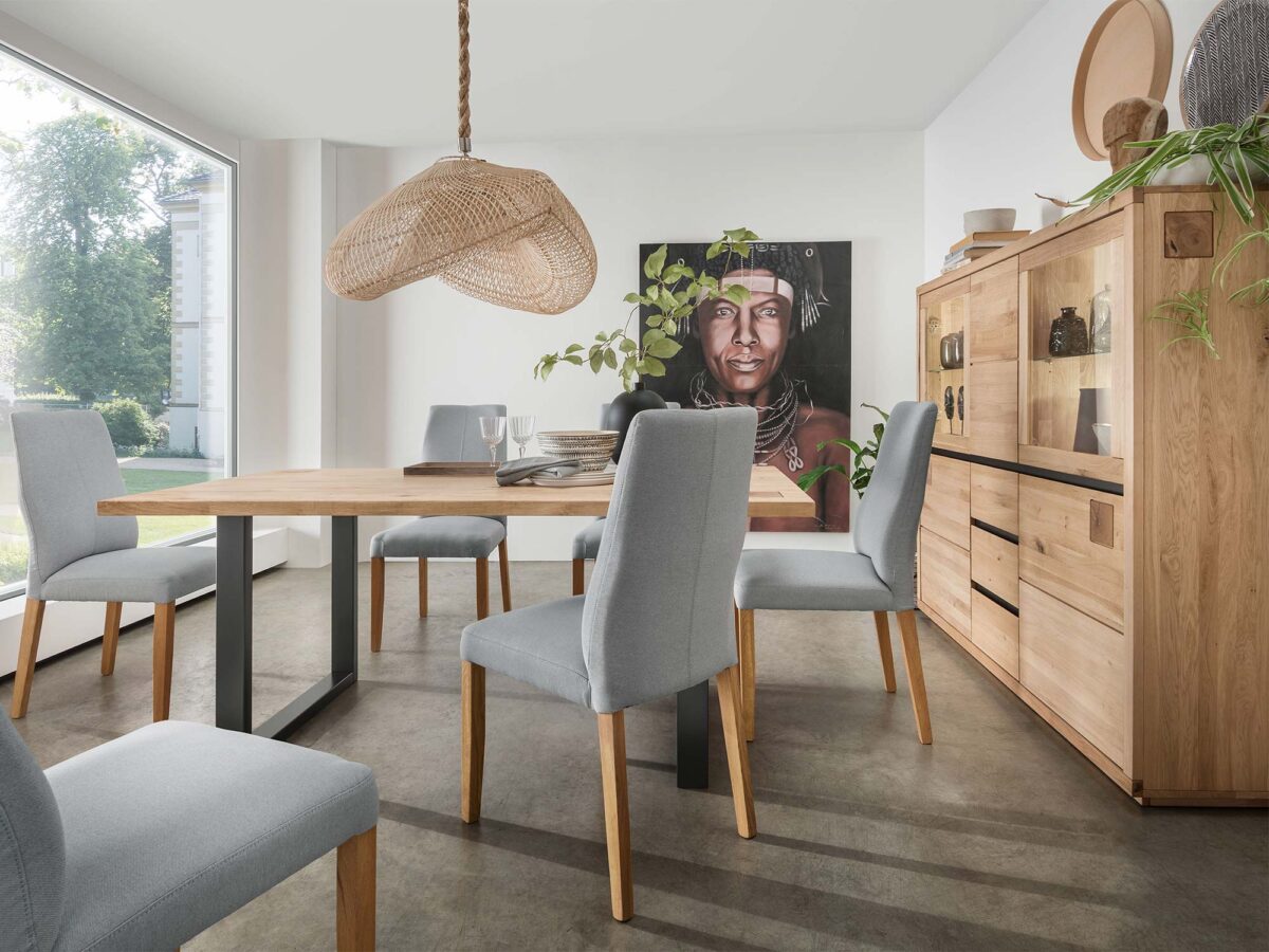To, co idealnie komponuje się z masywnym blatem, to stabilna podstawa wykonana z drewna. Drewniana konstrukcja, malowana na czarno, dodaje stołowi nowoczesnego, surowego charakteru i gwarantuje jego stabilność. Jest to kombinacja, która z pewnością przyciągnie wzrok wszystkich gości.