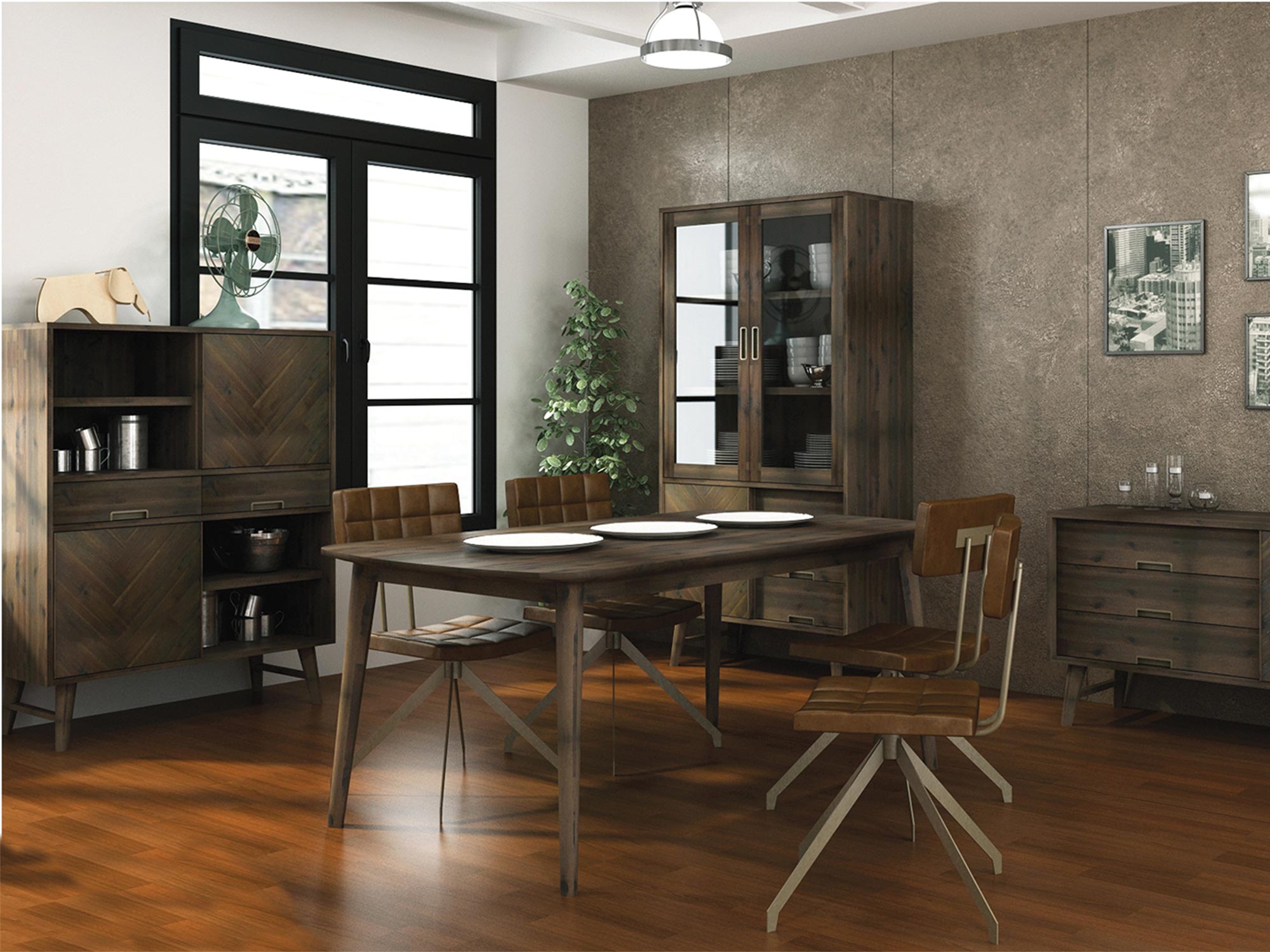 Stół stylowy, masywny z litego szczotkowanego drewna, nawiązujący do stylu retro, vintage i boho, o pięknym brązowym zabarwieniu, na solidnych drewnianych nogach. Stół posiada blat w pełni drewniany o wyraźnej strukturze.