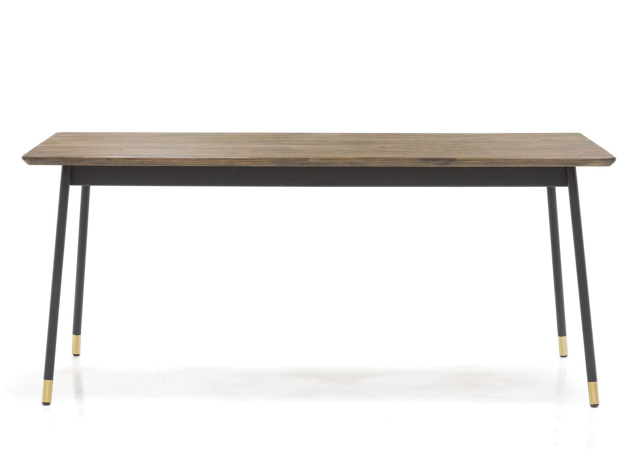Stół Enigma łączy retro styl z nowoczesnymi akcentami, tworząc mebel, który wyróżnia się na tle innych. Wykonany z wysokiej jakości szczotkowanego drewna akacji egzotycznej, stół posiada elegancki jasnobrązowy kolor, który doskonale komponuje się z czarnymi metalowymi nogami zakończonymi subtelnymi złotymi akcentami. Jego prosta forma idealnie pasuje do nowoczesnych, jak i klasycznych wnętrz. Stół jest solidny, trwały i funkcjonalny, a jego estetyczny design sprawia, że staje się centralnym punktem każdej przestrzeni. Dzięki połączeniu naturalnych materiałów z metalowymi elementami, stół Enigma wnosi do wnętrza elegancję i styl.