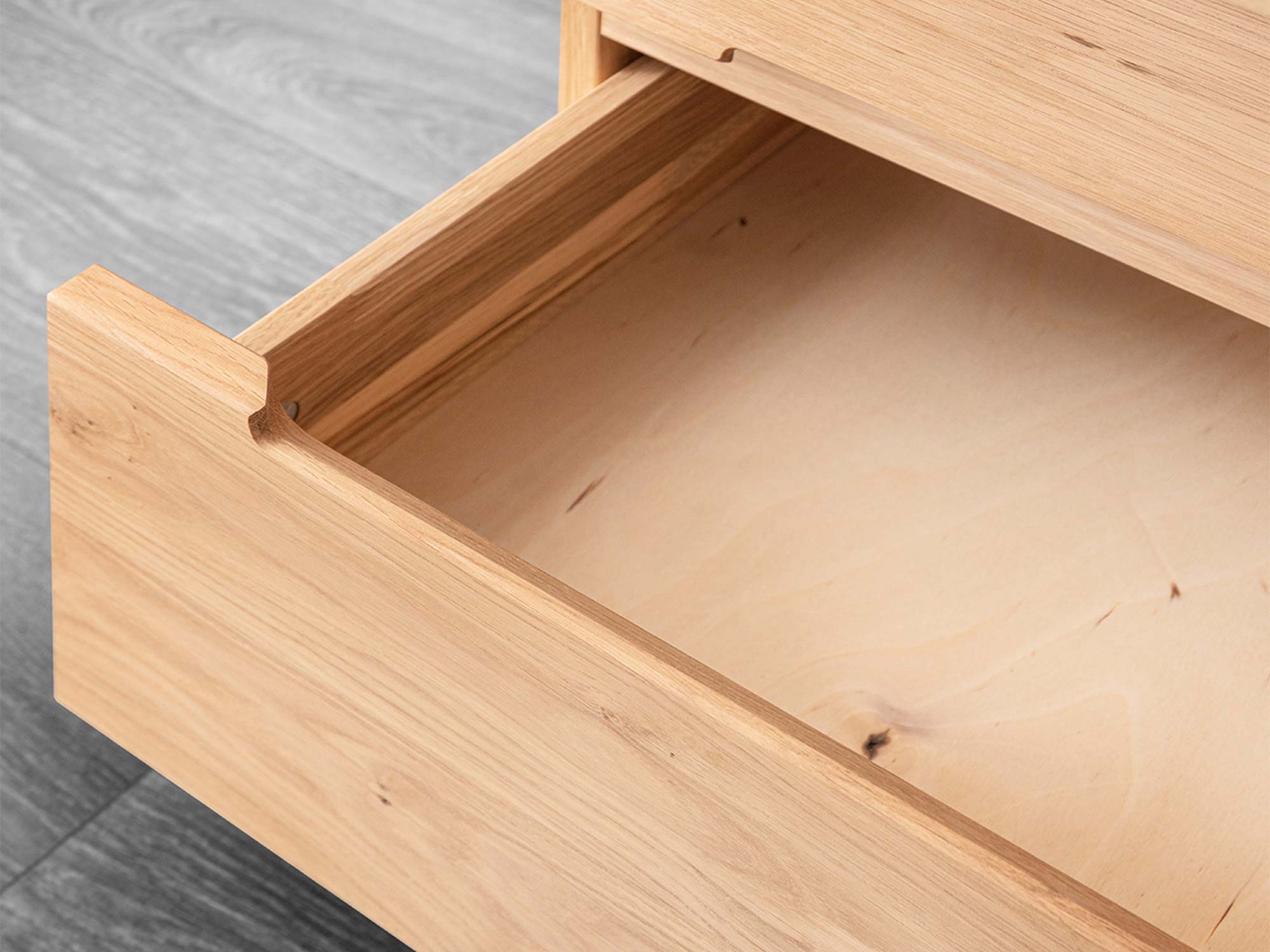 O funkcjonalności decydują trzy praktyczne szuflady. Każda z nich mieści to, co chcesz mieć pod ręką: od książek i czytnika, po okulary, kosmetyki czy ładowarki. Prowadnice Softclose Haefele zapewniają płynne, bezgłośne domykanie, które docenisz szczególnie nocą. To detal, który szybko staje się codziennym komfortem – brak trzasków, brak pośpiechu, tylko spokój.