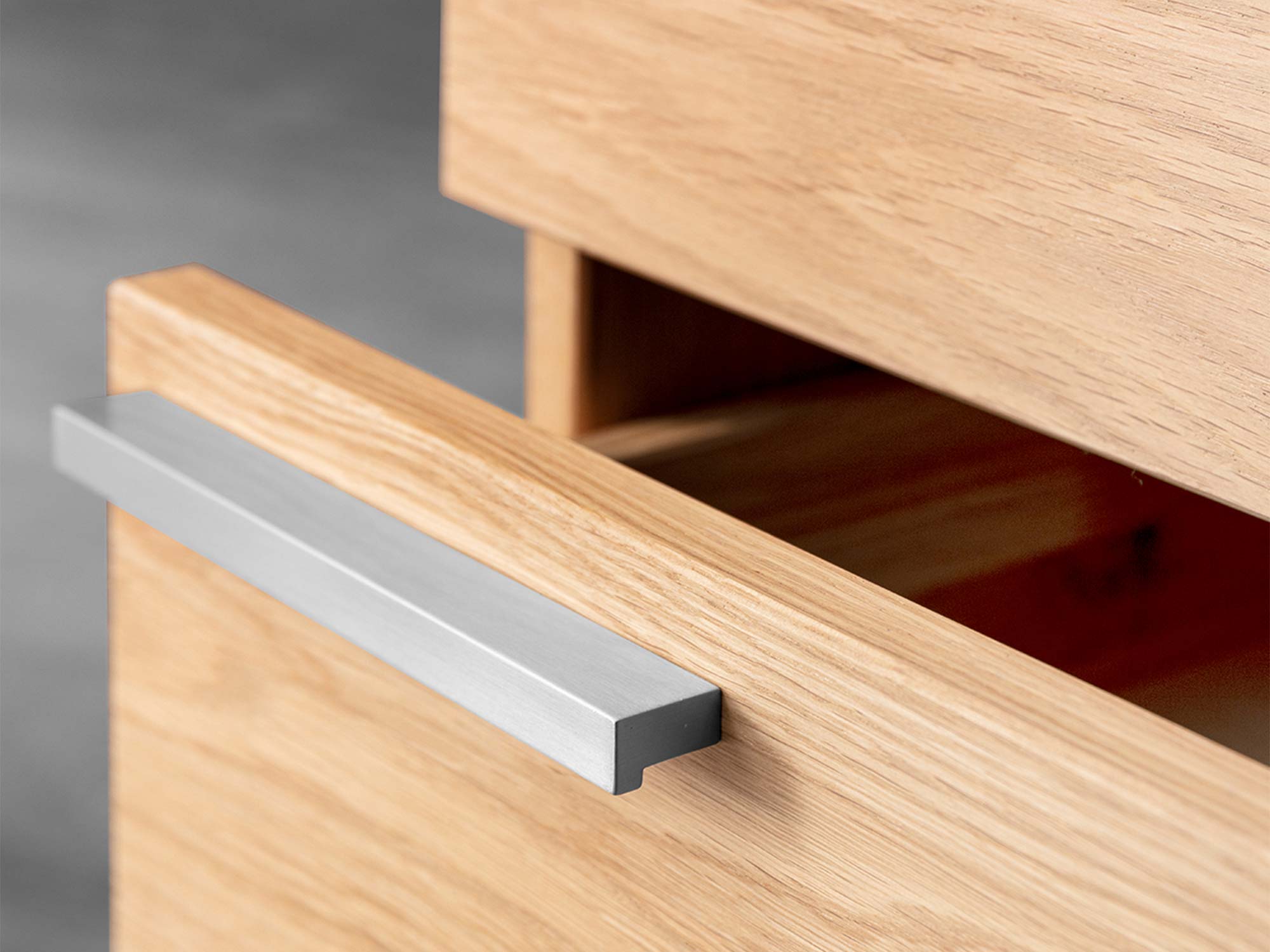 Olejowosk, którym wykończono powierzchnię, nie tylko podkreśla naturalne piękno dębu, ale także chroni drewno przed codziennym użytkowaniem. Nadaje subtelny mat, który współgra zarówno z jasnymi, jak i ciemnymi aranżacjami. Co ważne, olejowosk sprawia, że pielęgnacja szafki jest niezwykle prosta – wystarczy regularne przecieranie, by mebel zachował świeżość przez lata.