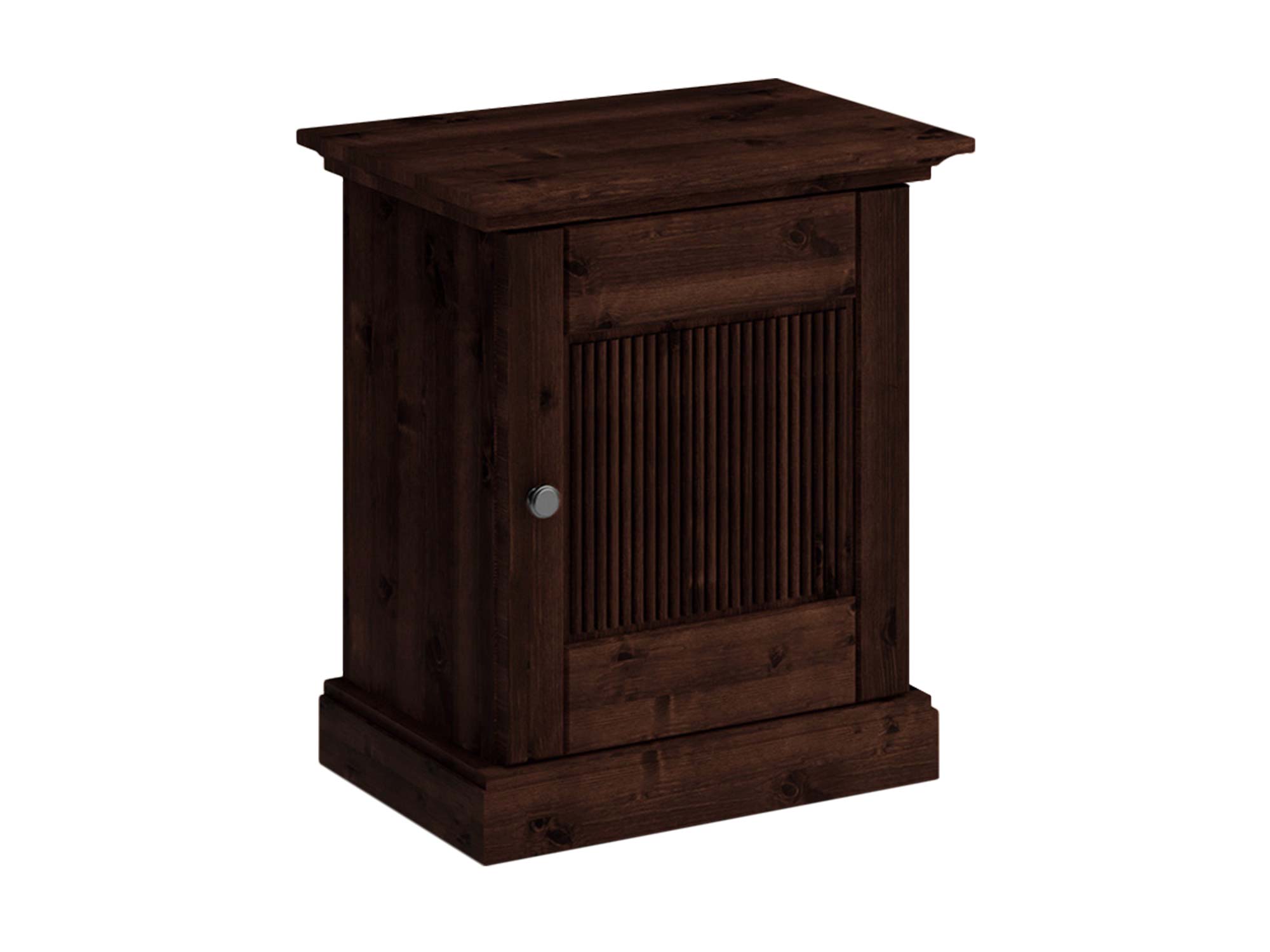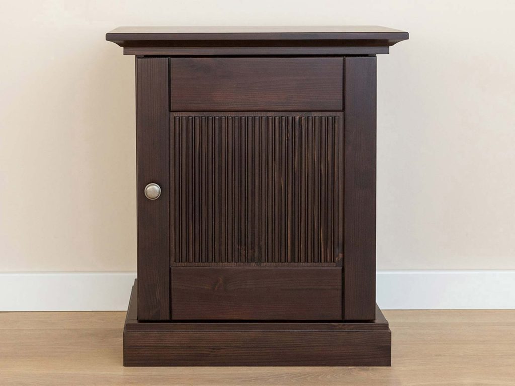 Elegancki nowoczesny sosnowy mebel Kalari to prawa szafka nocna z litej sosny w szlachetnym odcieniu tabacco, która łączy emocjonalny urok naturalnego drewna z logicznie zaprojektowaną funkcjonalnością. Półtransparentna farba wodna (70% krycia) subtelnie odsłania słoje i sęki, dzięki czemu każdy egzemplarz jest jedyny w swoim rodzaju. Delikatnie frezowany front i metalowy uchwyt w kolorze starego srebra nadają całości klasy, a kompaktowe wymiary pozwalają łatwo wpasować mebel w niemal każdą aranżację – od prowansalskiej, przez rustykalną i skandynawską, aż po nowoczesną.
