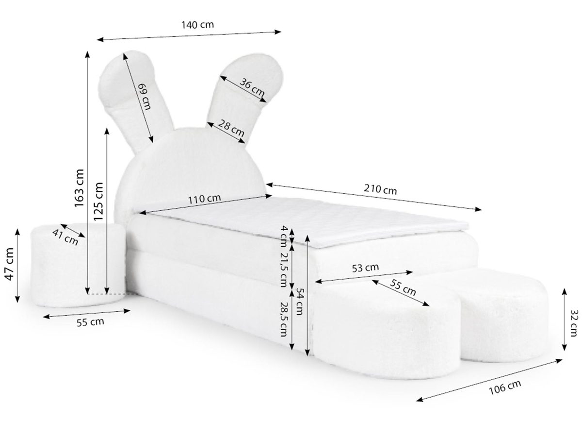 - Materiał: W całości tapicerowany miękką tkaniną, przyjemną w dotyku.