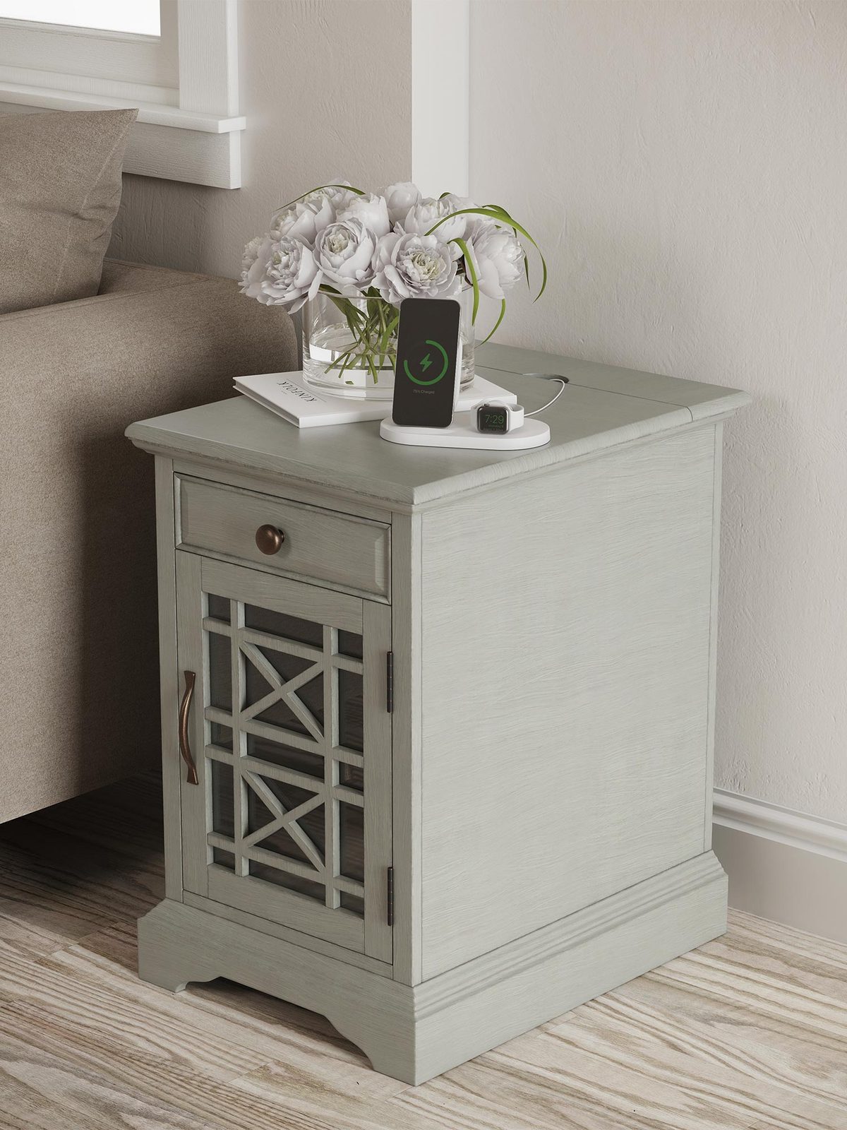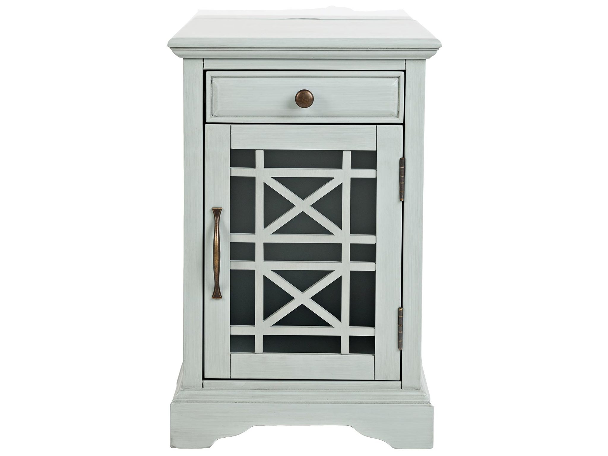 Szafka Nocna w Szaromiętowym Kolorze z Przeszklonymi Drzwiami i USB – Avola