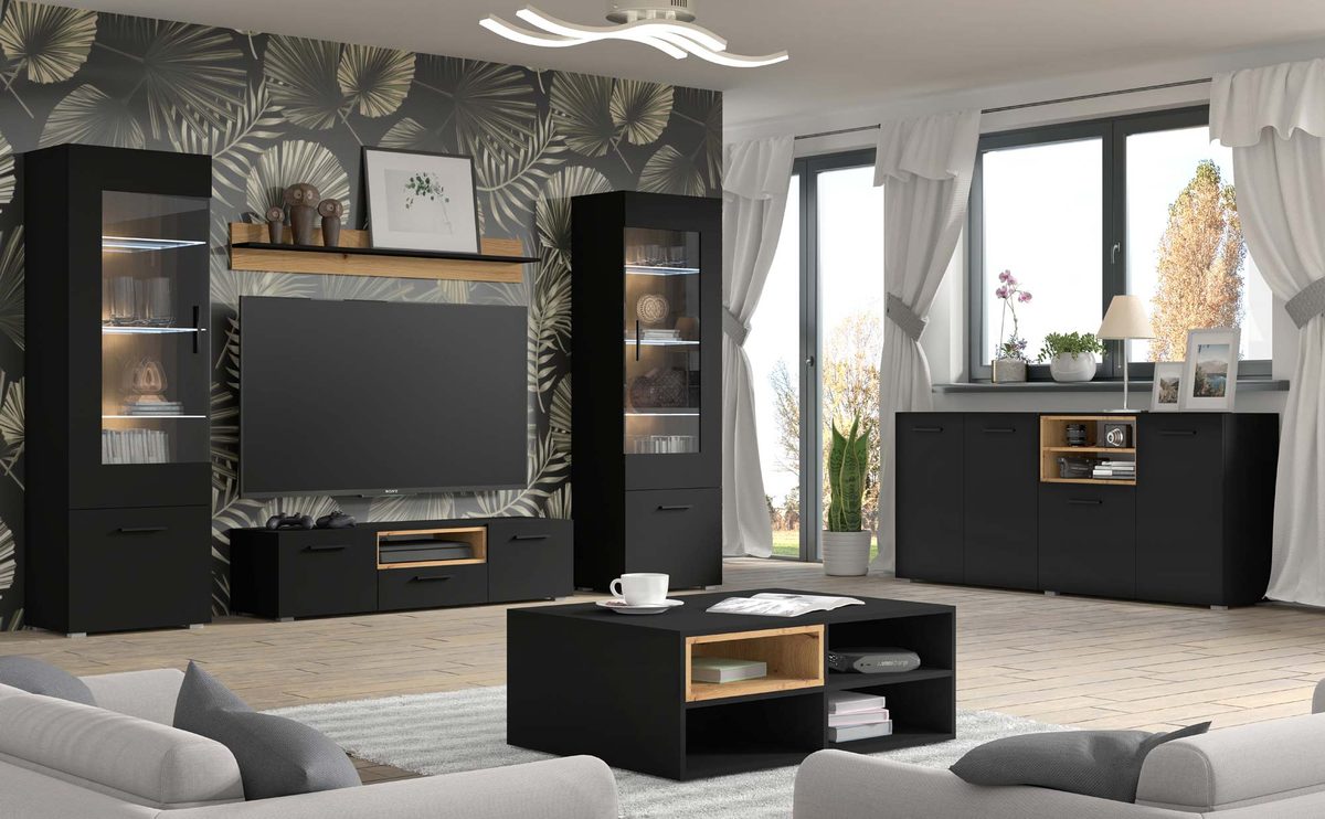 Co najważniejsze oferowana szafka RTV NIMET to niekonwencjonalna propozycja o klasycznej bryle i głębokim czarnym kolorze. Niewątpliwie fantastycznie zaprezentuje się w każdym nowoczesnym wnętrzu, mając na uwadze coraz częstsze wybieranie czerni jako kolor przewodni w salonie, co bezsprzecznie prezentuje się niezwykle elegancko i szykownie. Dodatkowo połączenie tej barwy z wstawkami w kolorze dąb artisan to nieszablonowe połączenie, które z pewnością przykuwa wzrok.