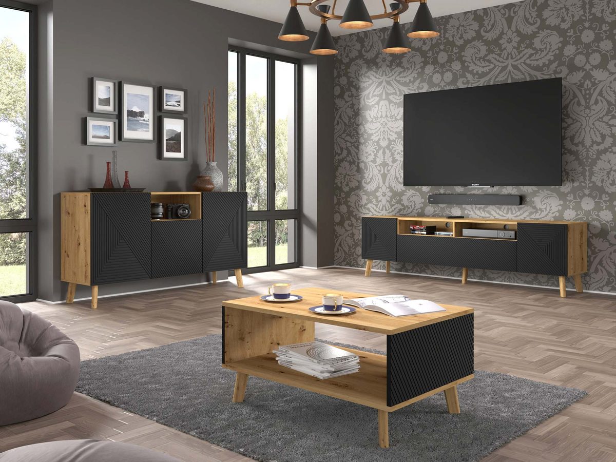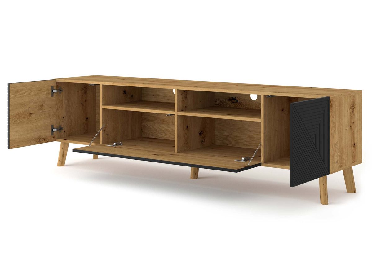 Prezentowana duża szafka pod TV to nieszablonowa propozycja do każdego nowoczesnego wnętrza. Swój wyjątkowy wygląd zawdzięcza unikalnym wyżłobieniom na froncie oraz ciekawym połączeniu czerni z odcieniem dąb artisan. Niewątpliwie doskonale zaprezentuje się w salonie czy pokoju dziennym projektowanym na styl loftowy czy industrialny. Z pewnością nie przytłoczy przestrzeni, a będzie prezentować się niezwykle elegancko i szykownie.