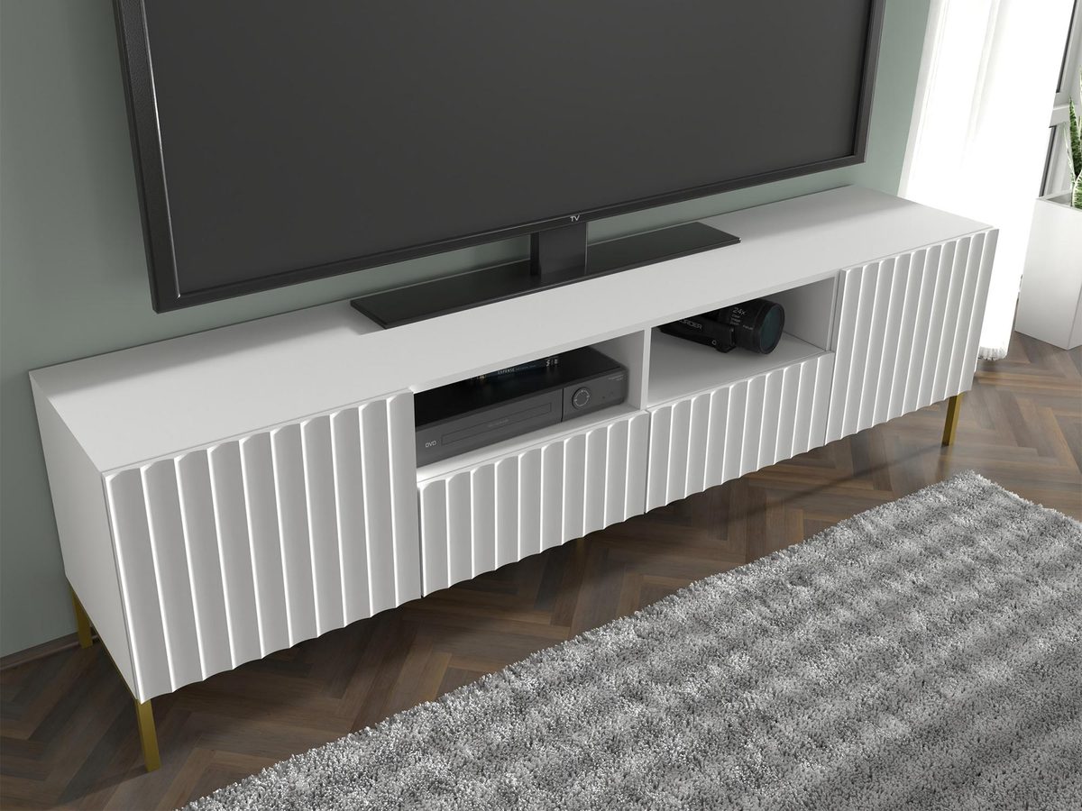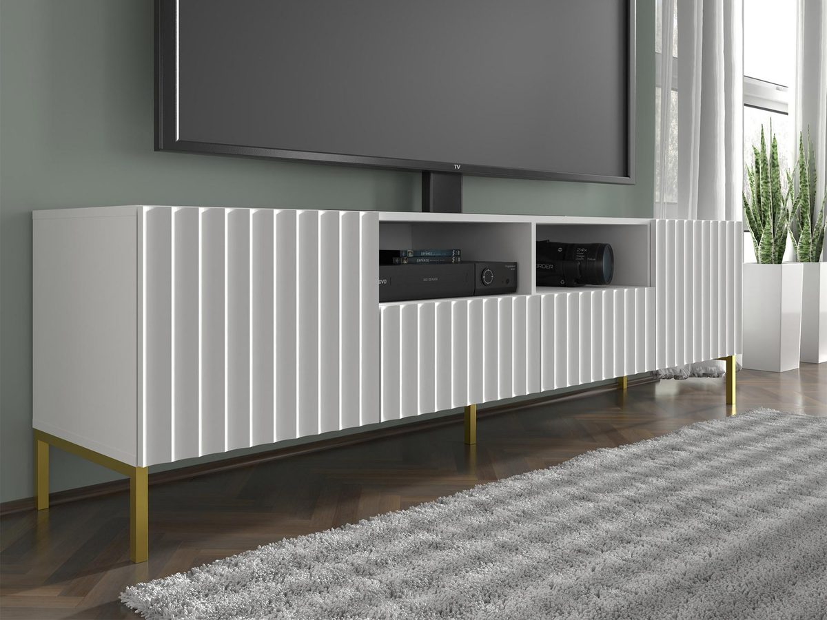 Biała szafka RTV z pionowymi listwami, otwierane drzwi, złote nóżki