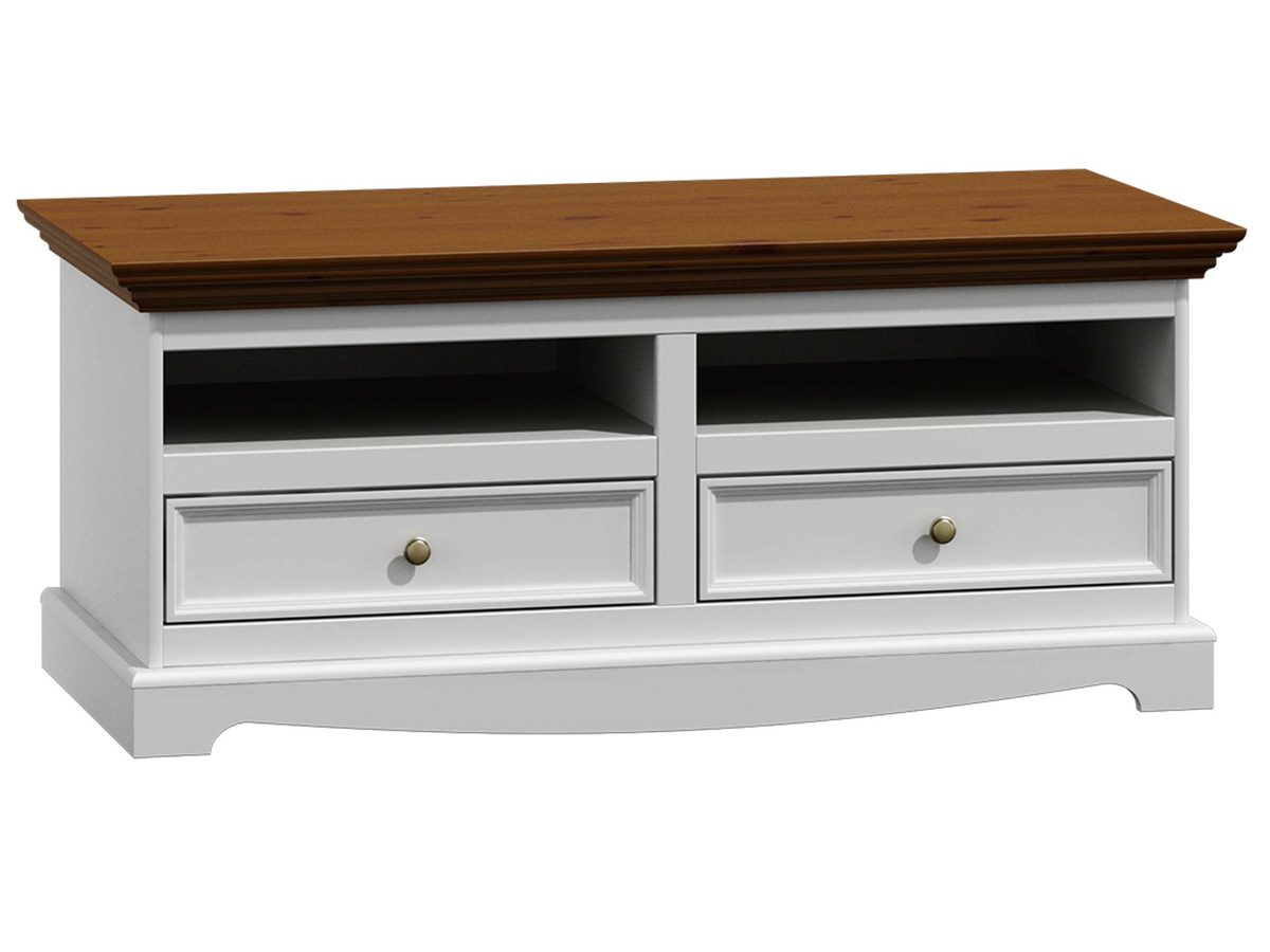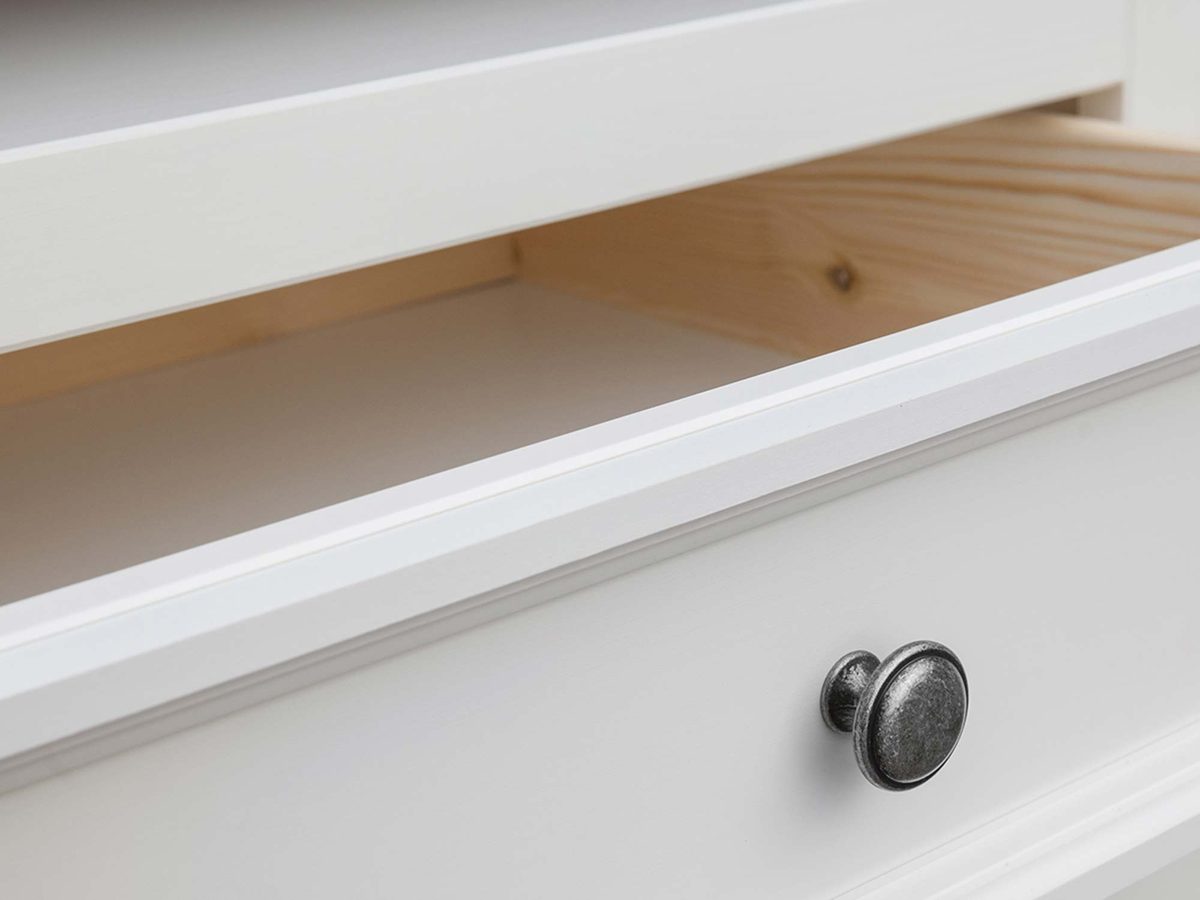 Oferowana drewniana biała szafka RTV mimo swoich małych gabarytów zapewnia wszystko czego potrzeba. Przede wszystkim zawiera niezbędną przestrzeń otwartą na zamontowanie dekoderów czy konsoli jak i dwie szuflady, gdzie można przechowywać płyty, piloty czy inne akcesoria. Dodatkowo blat pozwala zarówno na postawienie telewizora lub w przypadku powieszenia go, wyeksponowanie drobnych dekoracji czy pamiątek rodzinnych. Co więcej metalowe uchwyty w kolorze starego złota/srebra nadają meblu niepowtarzalny charakter. Ponadto subtelne frez, podstawa oraz wykończenie blatu na styl prowansalski to doskonała propozycja do każdego nowoczesnego wnętrza, która nawet z upływem lat i zmiany trendów nie utraci na swojej aktualności. Dodatkowo przedstawiona klasyczna biała szafka RTV w połączeniu z innymi meblami z serii INGRID pozwoli stworzyć przytulną, praktyczną, pełną elegancji przestrzeń.