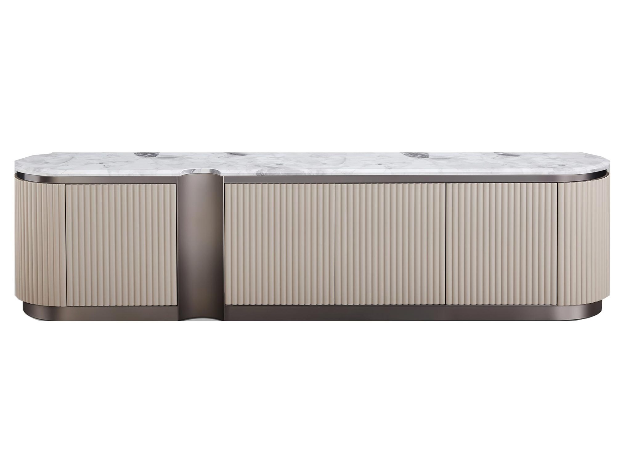 Stylowa komoda RTV w beżowym kolorze, która łączy nowoczesny design z funkcjonalnością. Elegancki niklowany wieniec dolny i marmurowy blat podkreślają luksusowy charakter mebla, natomiast solidne ryflowane drewno oraz innowacyjne rozwiązania techniczne zapewniają wygodę i trwałość użytkowania. Wybierz wyjątkową komodę, która doda wnętrzu klasy i harmonii.