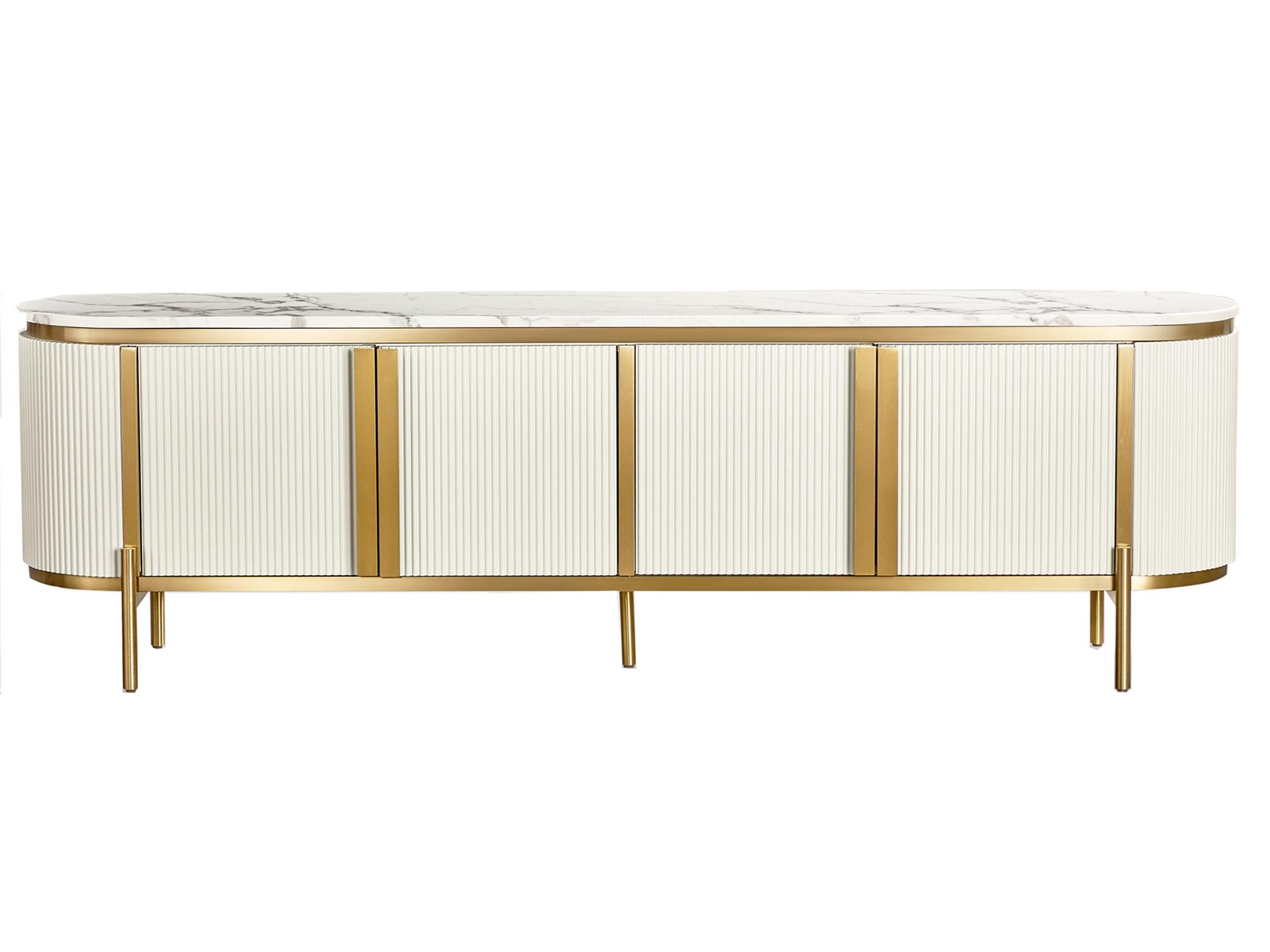 Stylowa komoda rtv w delikatnym kolorze białego ecru, wzbogacona złotymi akcentami i marmurowym blatem. Prosta bryła mebla została uzupełniona ryflowanym drewnem oraz eleganckimi stalowymi uchwytami. Idealna zarówno do nowoczesnych, jak i klasycznych wnętrz.