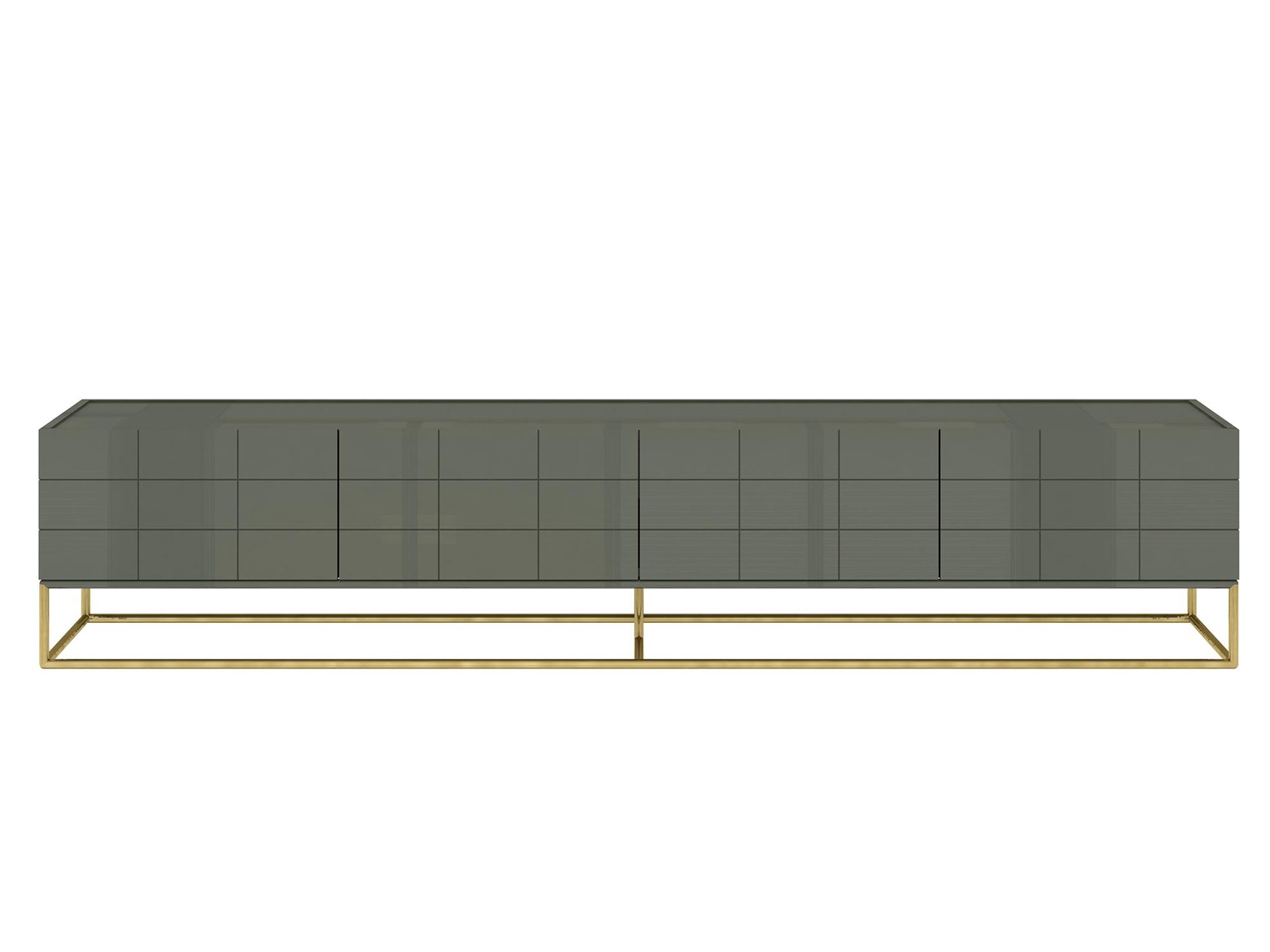 Komoda rtv w stylu modern classic w kolorze cementowej zieleni z kontrastującymi nogami w kolorze złota wykonane ze stali nierdzewnej. Korpus z płyty MDF w połysku. Fronty 3D w połączeniu z minimalistyczną formą bryły tworzą harmonijna całość.