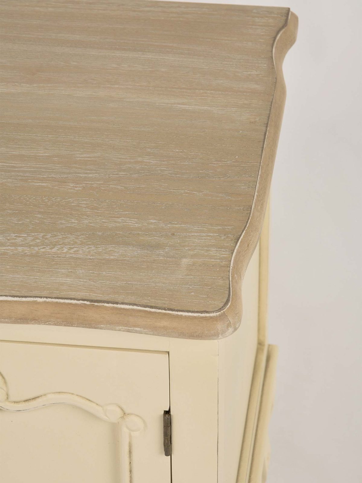 Komoda RTV Sorrento to mebel, który łączy klasyczny styl z nowoczesnymi rozwiązaniami. Korpus komody w kolorze kremowym wykonany z drewna paulowni to połączenie lekkości i trwałości. Blat z frezowanymi krawędziami w odcieniu jasnobrązowym, widoczna struktura drewna oraz metalowe uchwyty podkreślają elegancki wygląd komody. Ozdobne rzeźbienia na cokole oraz gięte nóżki nadają jej prowansalskiego uroku, który sprawdzi się zarówno w tradycyjnych, jak i nowoczesnych wnętrzach. Dzięki ręcznemu malowaniu, każdy egzemplarz komody jest unikalny, co sprawia, że będzie to wyjątkowy element wyposażenia Twojego salonu.