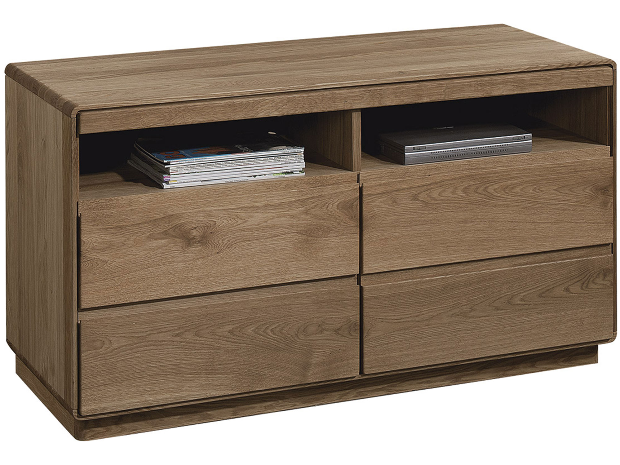 Przedstawiona obok drewniana szafka pod telewizor to wyjątkowy mebel, nadający każdej aranżacji eleganckiego stylu i dobrego smaku. Ponadto materiały wysokiej jakości zostały wykorzystane do produkcji szafki, składa się ona z najlepszego litego drewna dębowego z elementami fornirowanymi. Co więcej mała drewniana szafka RTV jest wyposażona w drzwi, za którymi znajduje się przestrzeń do przechowywania sprzętu RTV niewielkich rozmiarów czy drobiazgów oraz dwie szuflady.