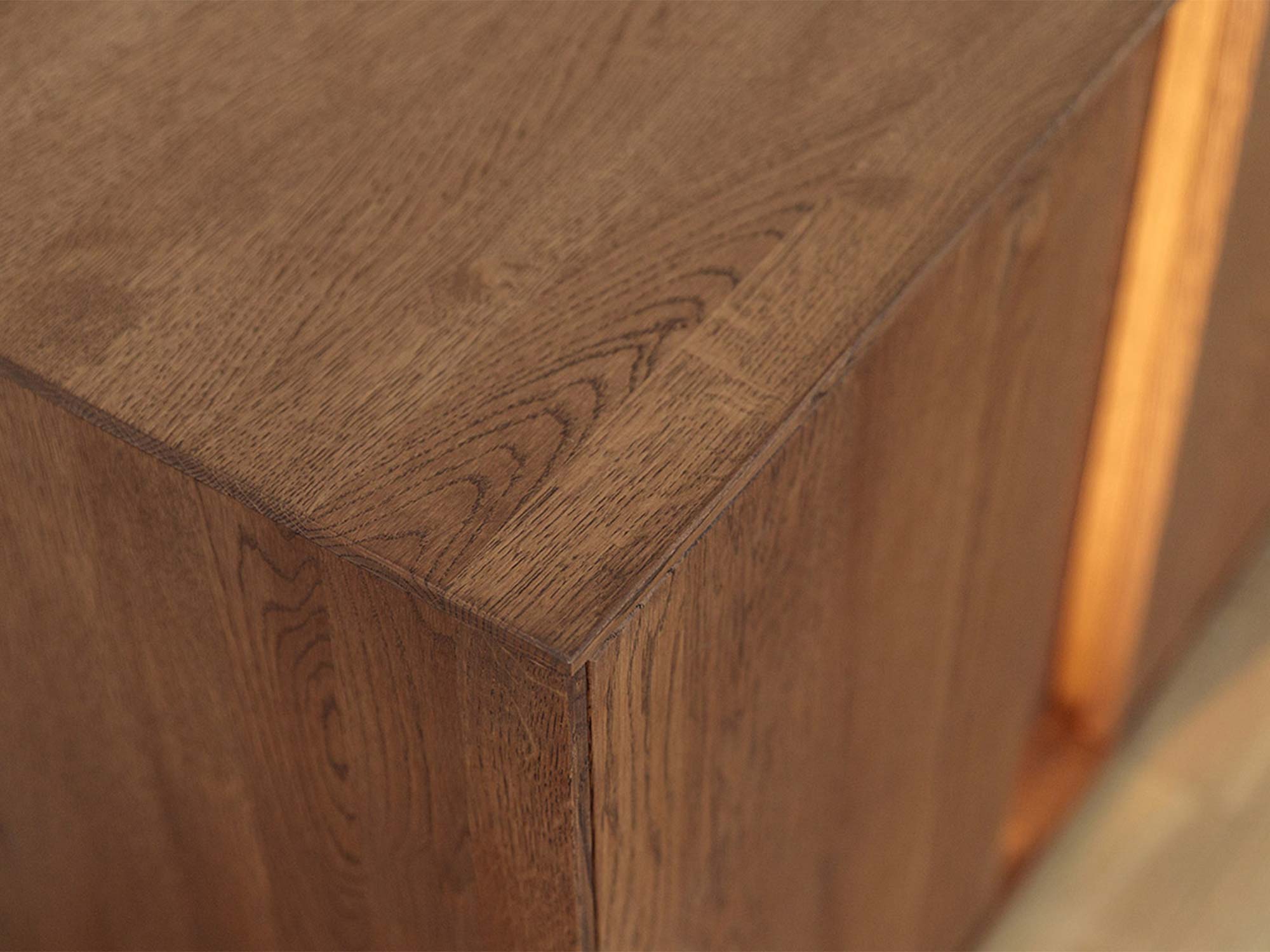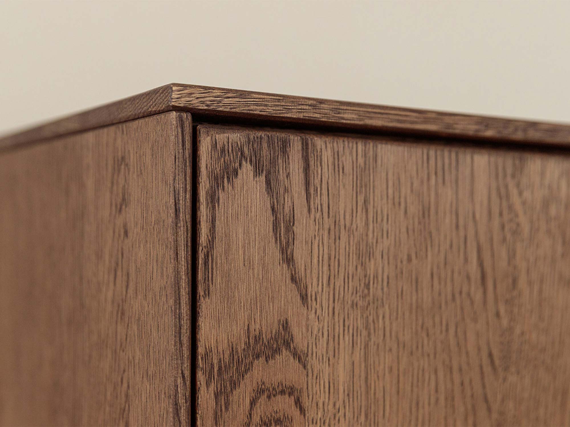 Szeroka szafka RTV Essentia to mebel, który łączy w sobie minimalizm i elegancję. Prosta, geometryczna forma sprawia, że doskonale pasuje zarówno do wnętrz w stylu loftowym, jak i do aranżacji skandynawskich czy klasycznych. Drewno dębowe w ciepłym odcieniu tabacco podkreślone olejowaniem nadaje jej naturalnego uroku, a widoczne słoje sprawiają, że każdy egzemplarz jest niepowtarzalny.