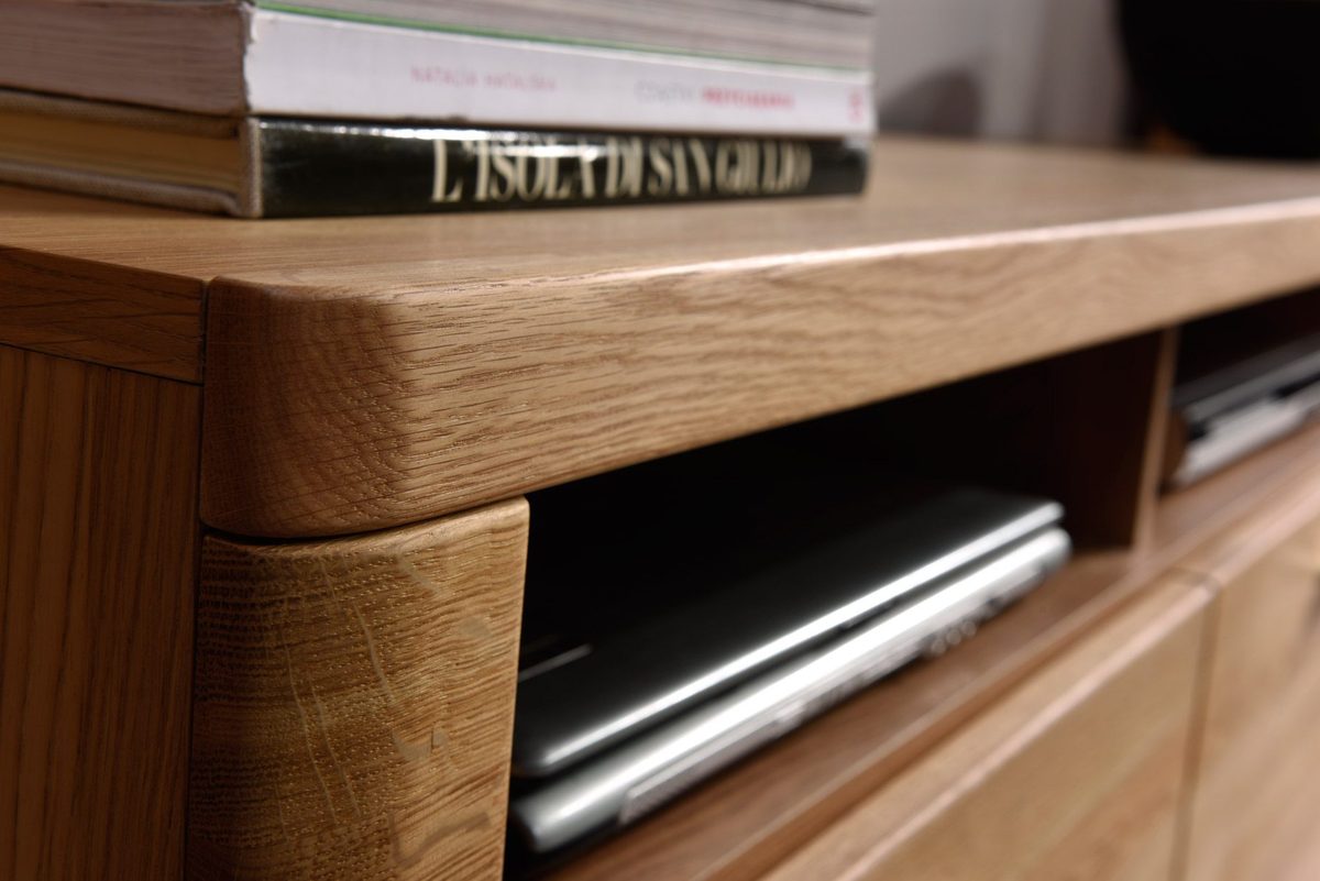 Stolik TV z kolekcji Sakuro wykonany z litego drewna i forniru, posiada praktyczne szuflady, otwarte półki i otwory na kable.
