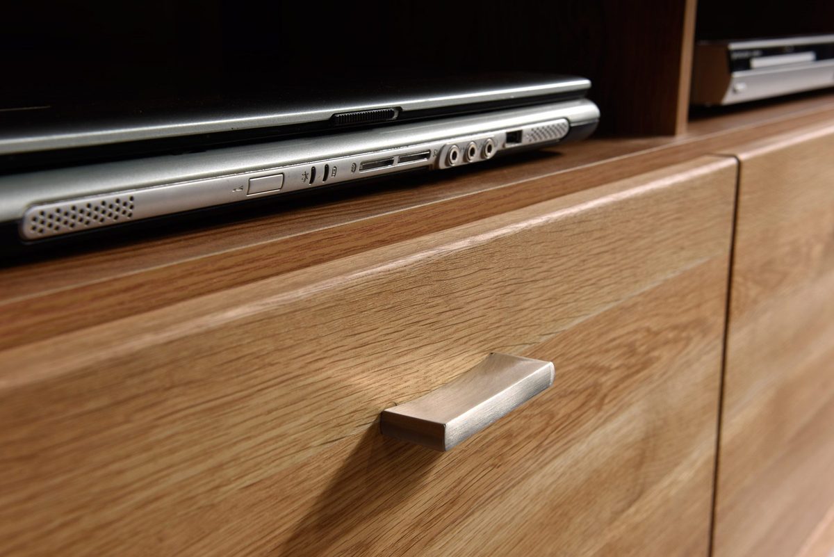 Prosta i elegancka szafka do salonu Sakuro wyprodukowana z najlepszej klasy litego dębu idealnie dopasuje się do każdego wnętrza niejednej jadalni czy kuchni. Co więcej stateczna struktura oraz eleganckie, nowoczesne wykończenie sprawią, że stolik Tv wspaniale ozdobi każde wnętrze. Mebel posiada trzy funkcjonalne i pojemne szuflady, które doskonale sprawdzą się w przechowywaniu sprzętu i akcesoriów RTV. Ponadto stolik TV ma trzy otwarte półki z otworami, które umożliwiają szybki i bezproblemowy montaż dekodera, odtwarzacza czy konsoli.