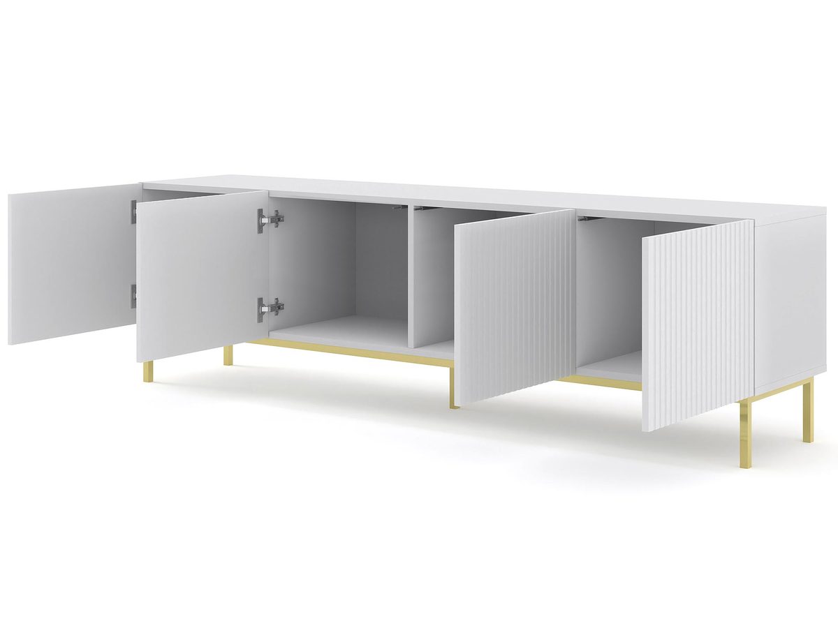 Stylowa Szafka Pod TV Navia 200 cm to mebel, który wprowadzi do Twojego wnętrza nowoczesność i elegancję. Biały matowy korpus i fronty nadają wnętrzu świeżości i lekkości, a złote nóżki dodają mu luksusowego charakteru. Dzięki temu szafka RTV Navia będzie doskonałym uzupełnieniem zarówno minimalistycznych, jak i bardziej klasycznych aranżacji, wnosząc do nich odrobinę nowoczesnego stylu. Wybierz Stylową Szafkę Pod TV Navia 200 cm i ciesz się pięknym oraz praktycznym meblem, który doda Twojemu wnętrzu nowoczesnego charakteru.